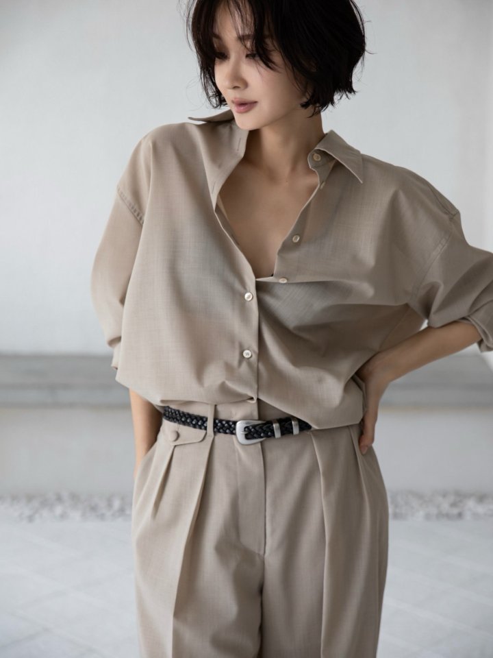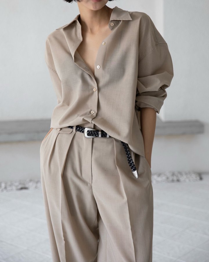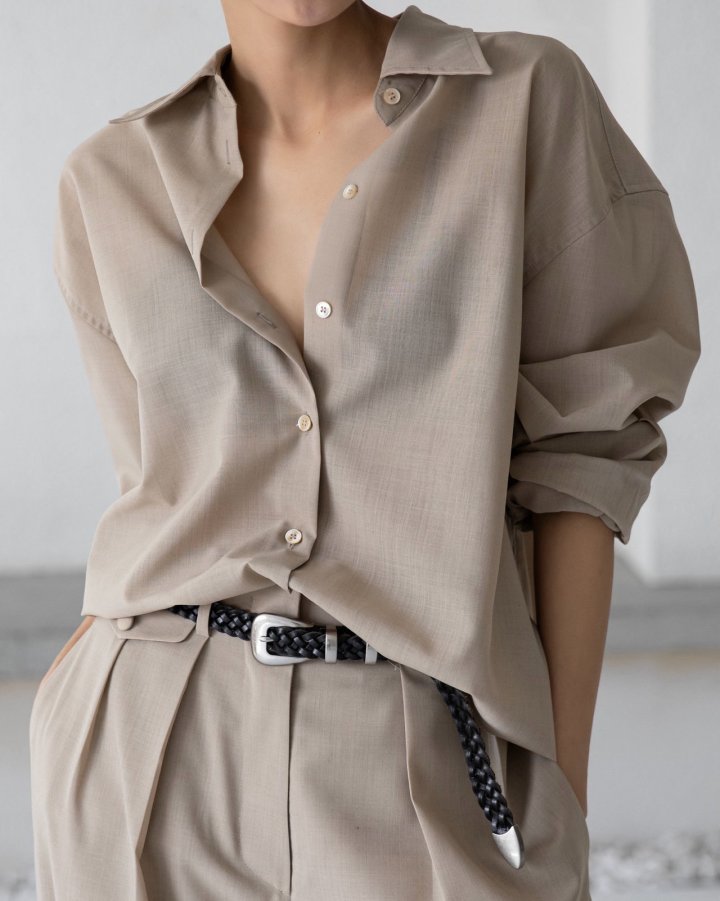 Oversized shirt with fluid lines, snap-button closure, and elongated sleeves. A versatile piece that embodies effortless minimalism.