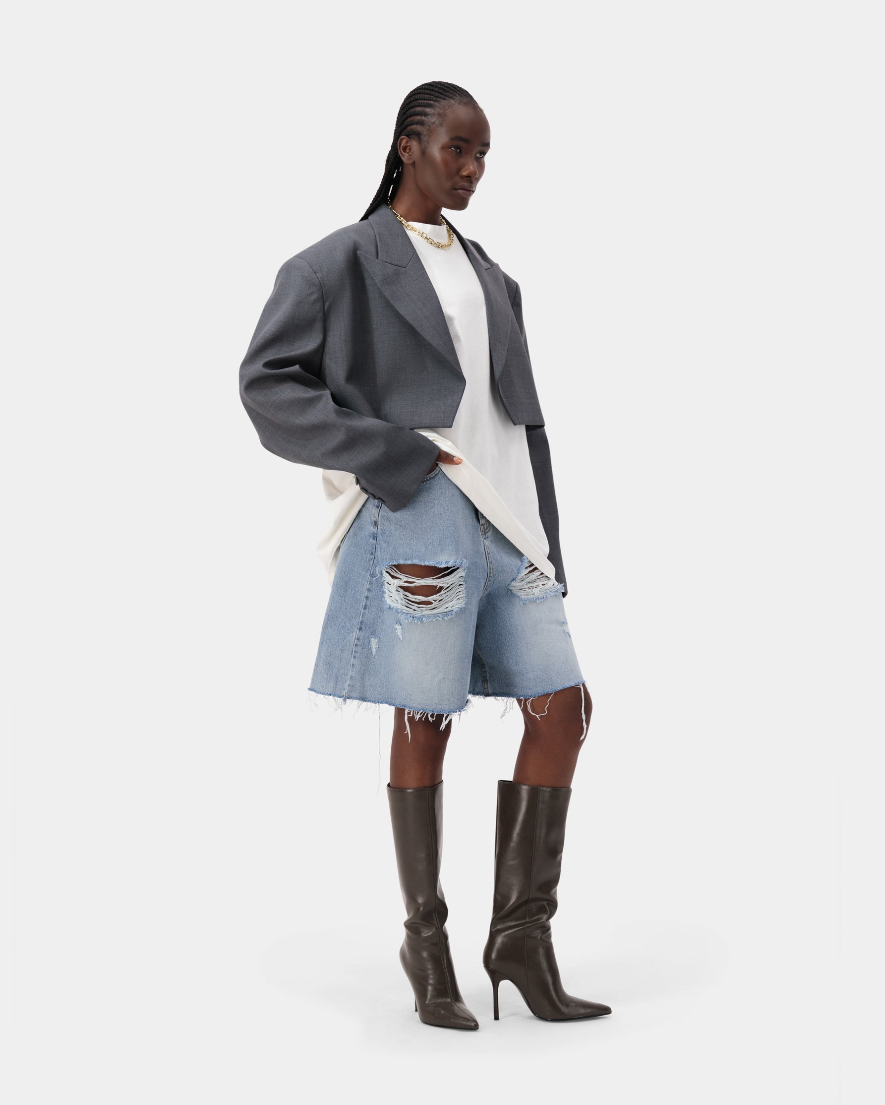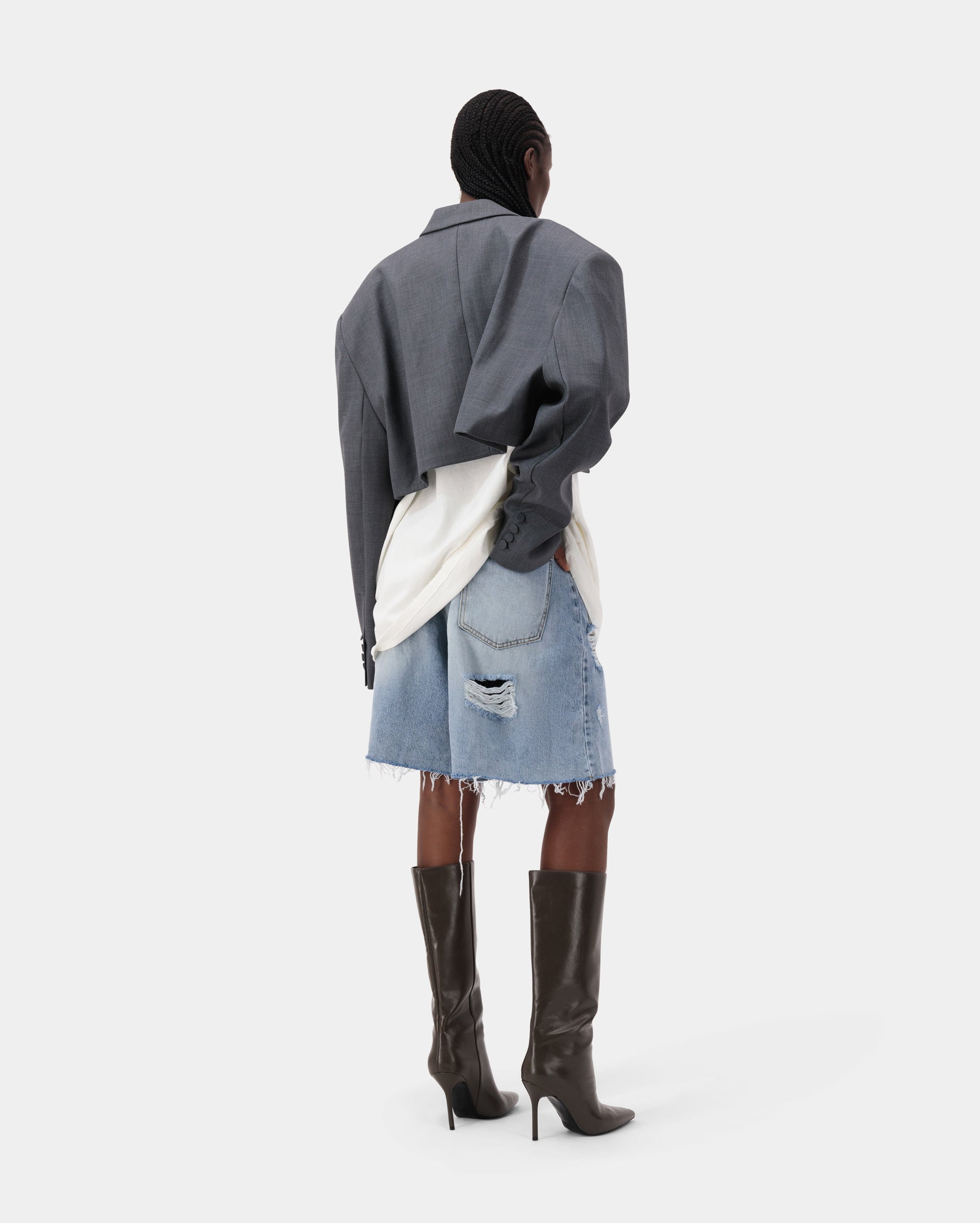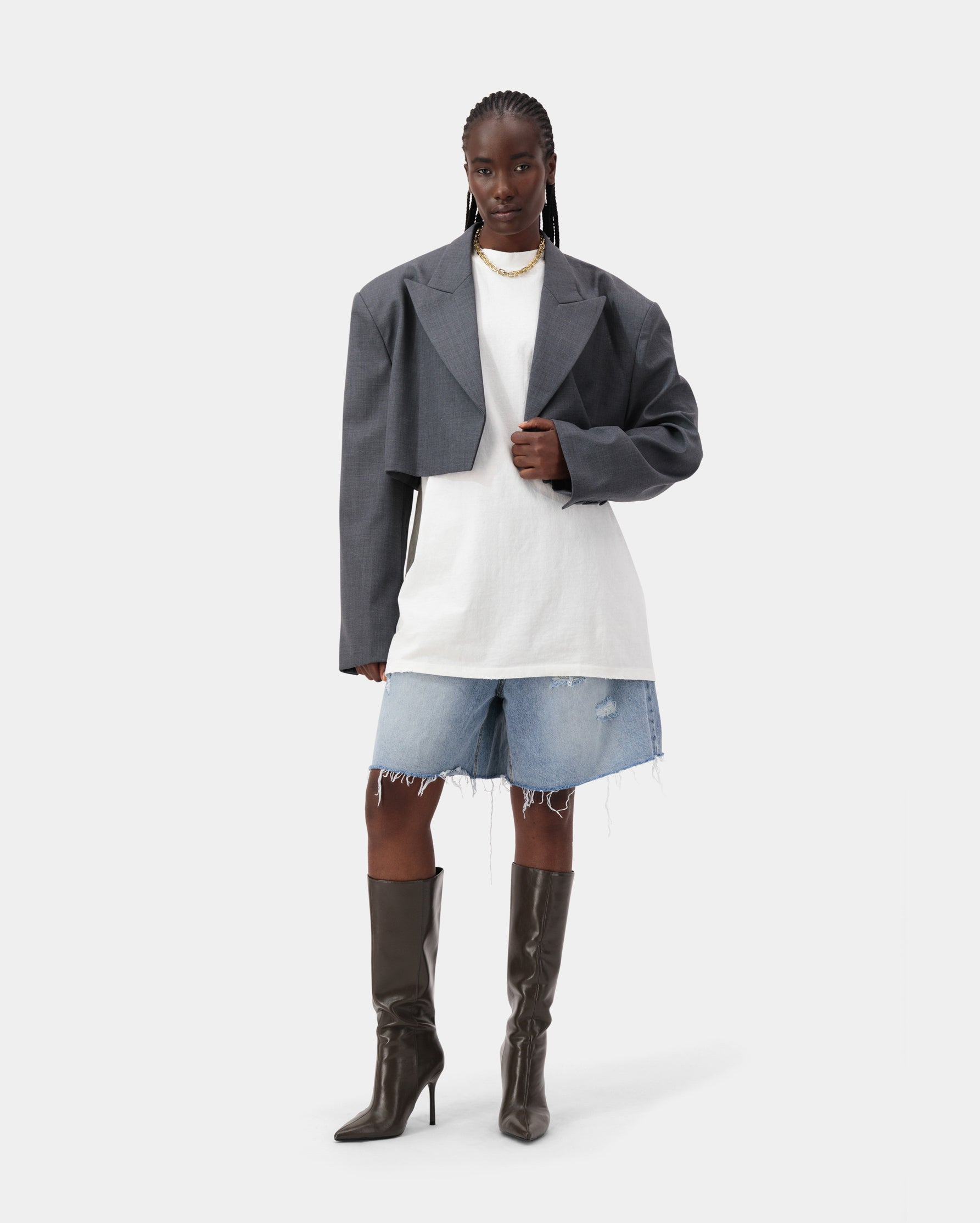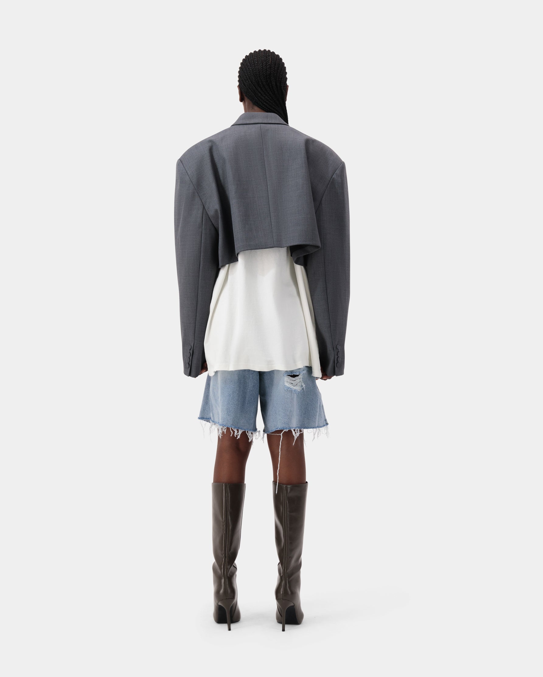 Wool peaked lapel buttonless cropped blazer, crafted from a wool-poly blend for a sleek and modern design.
