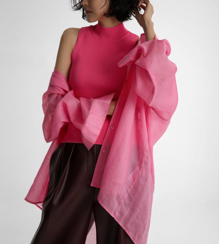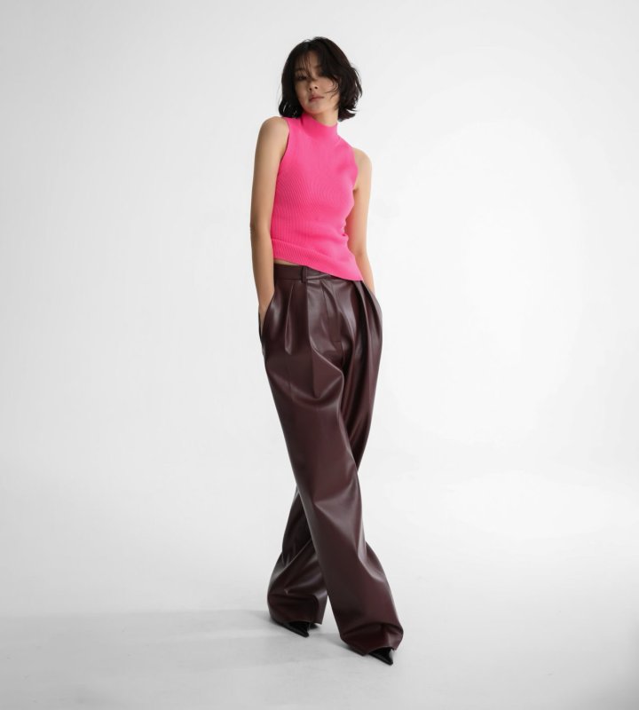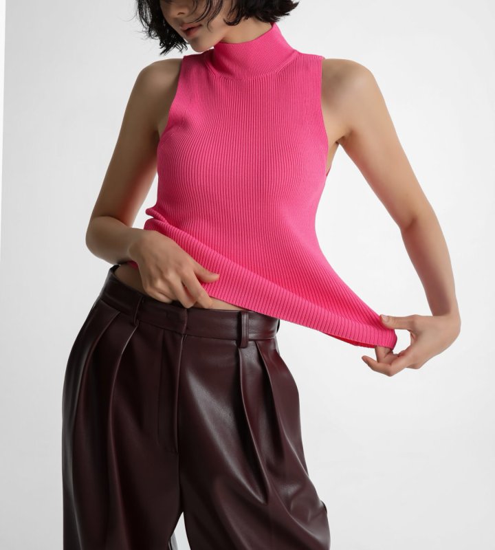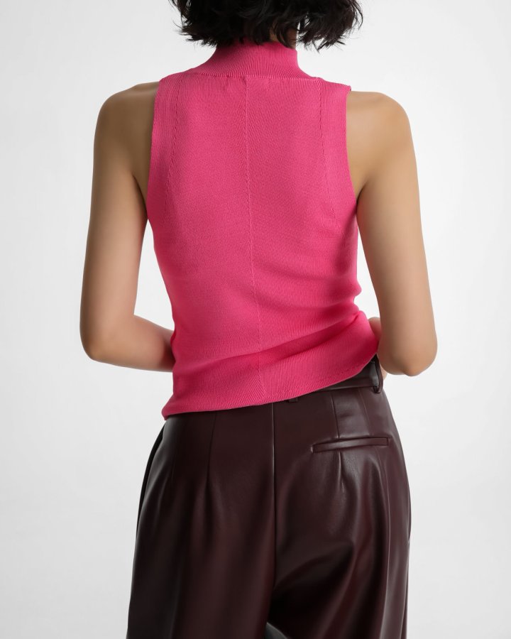 Ribbed sleeveless knit with high neckline. Minimal, versatile, timeless. Its minimal silhouette makes it versatile for layering or wearing alone