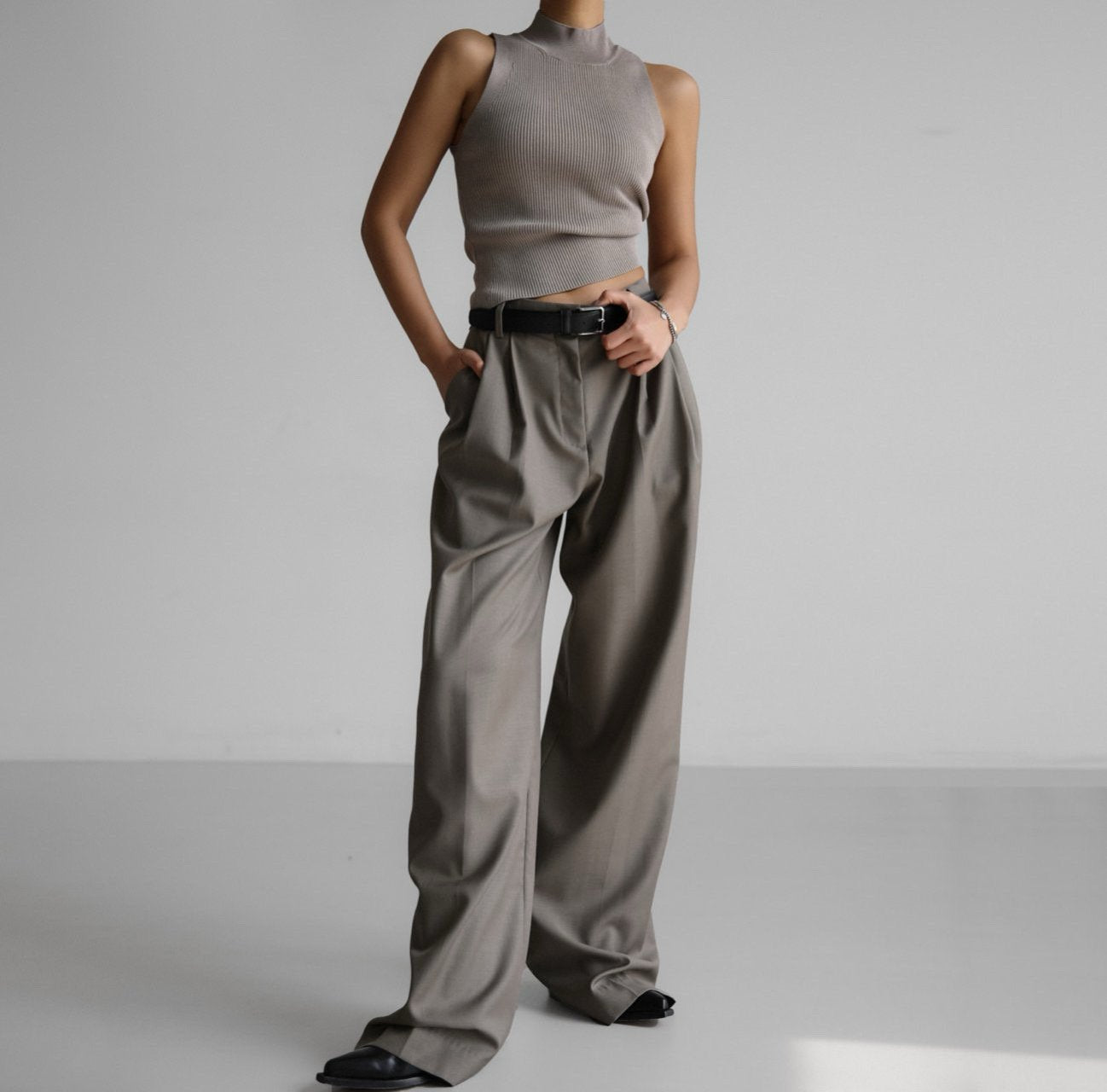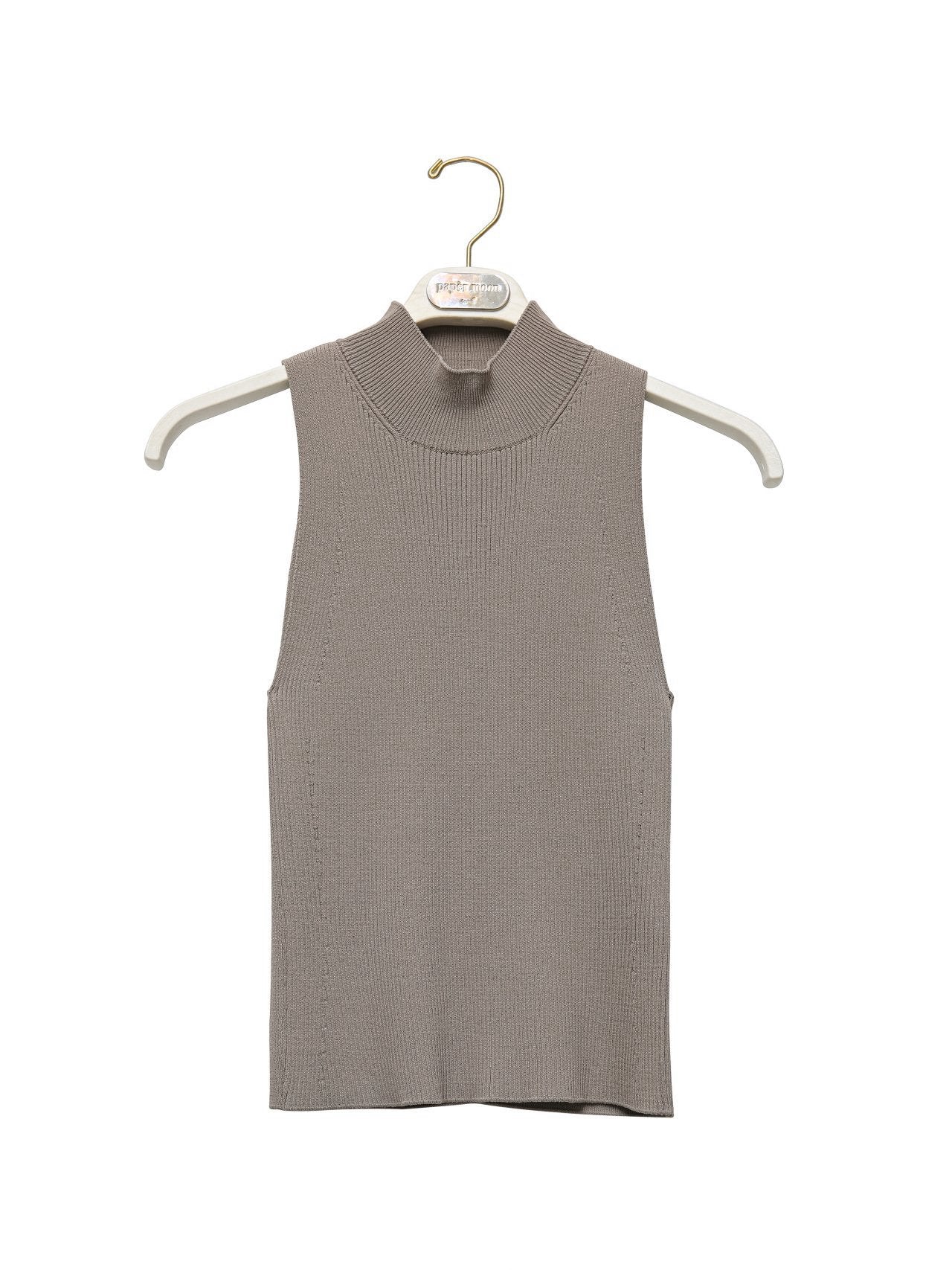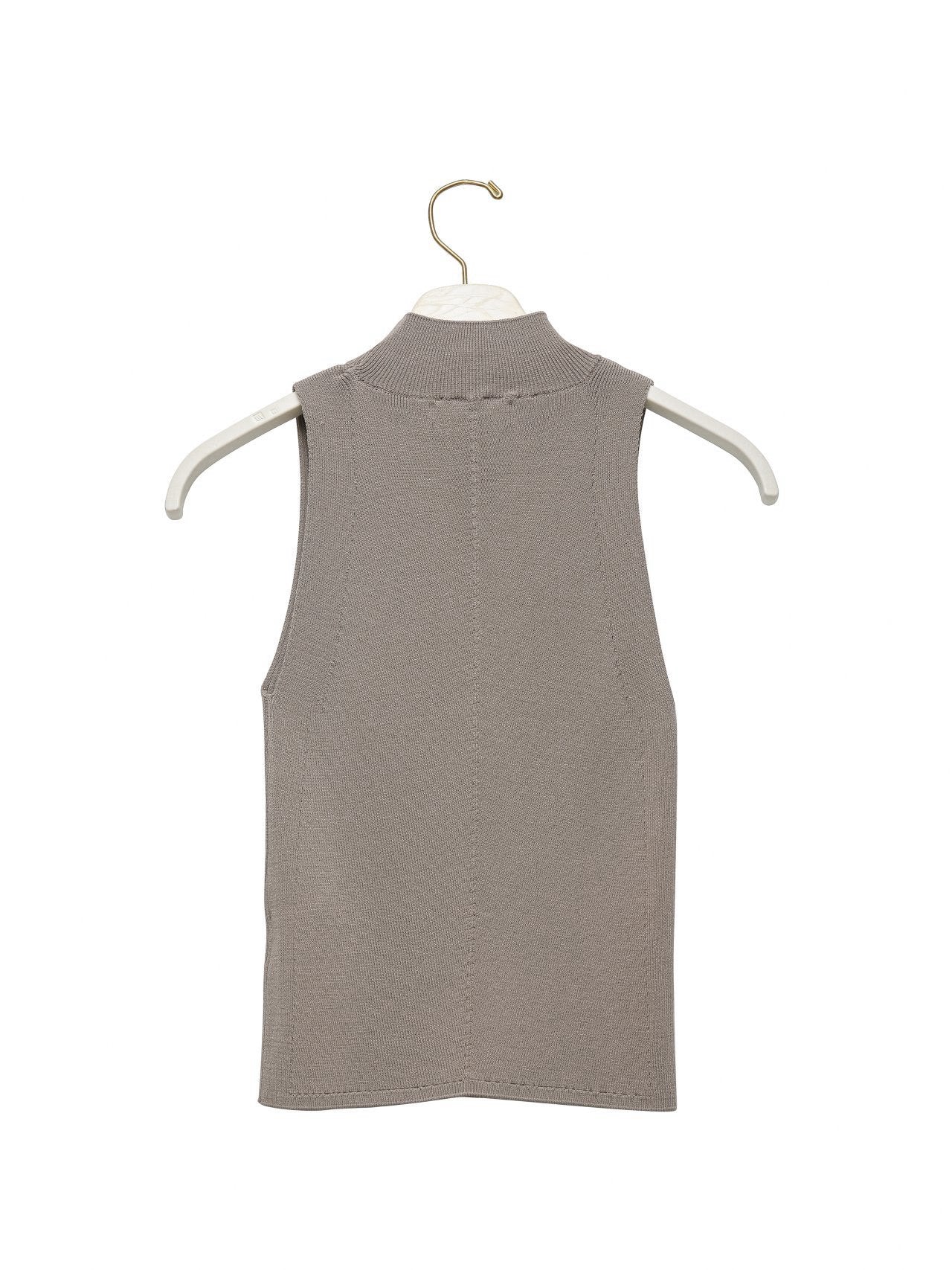 Ribbed sleeveless knit with high neckline. Minimal, versatile, timeless. Its minimal silhouette makes it versatile for layering or wearing alone