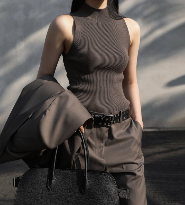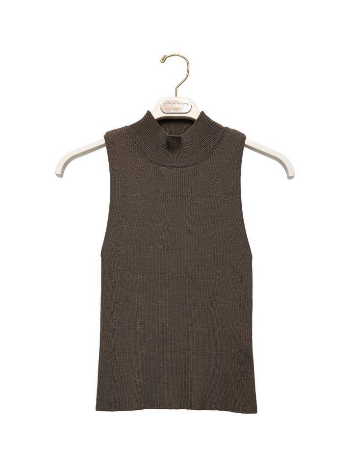 Ribbed sleeveless knit with high neckline. Minimal, versatile, timeless. Its minimal silhouette makes it versatile for layering or wearing alone