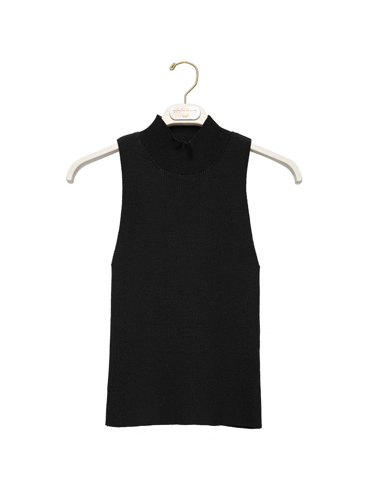 Ribbed sleeveless knit with high neckline. Minimal, versatile, timeless. Its minimal silhouette makes it versatile for layering or wearing alone