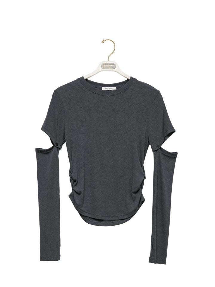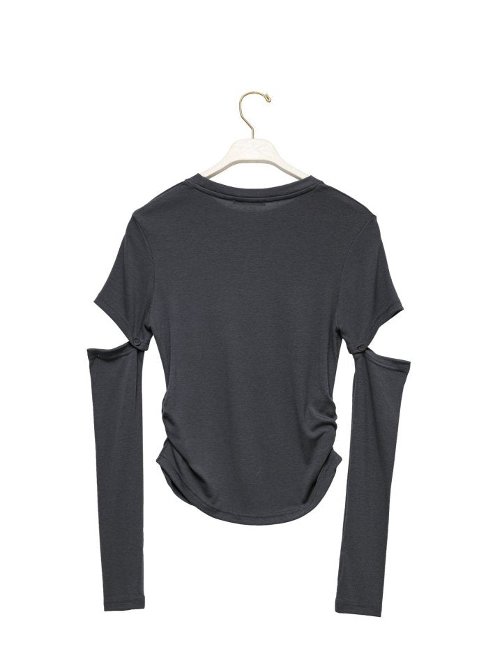 A modern cutout top with a versatile silhouette and detachable sleeves. It offers structure, comfort, and adaptable styling. Wear it with sleeves for a refined look, or without for a minimalist edge.