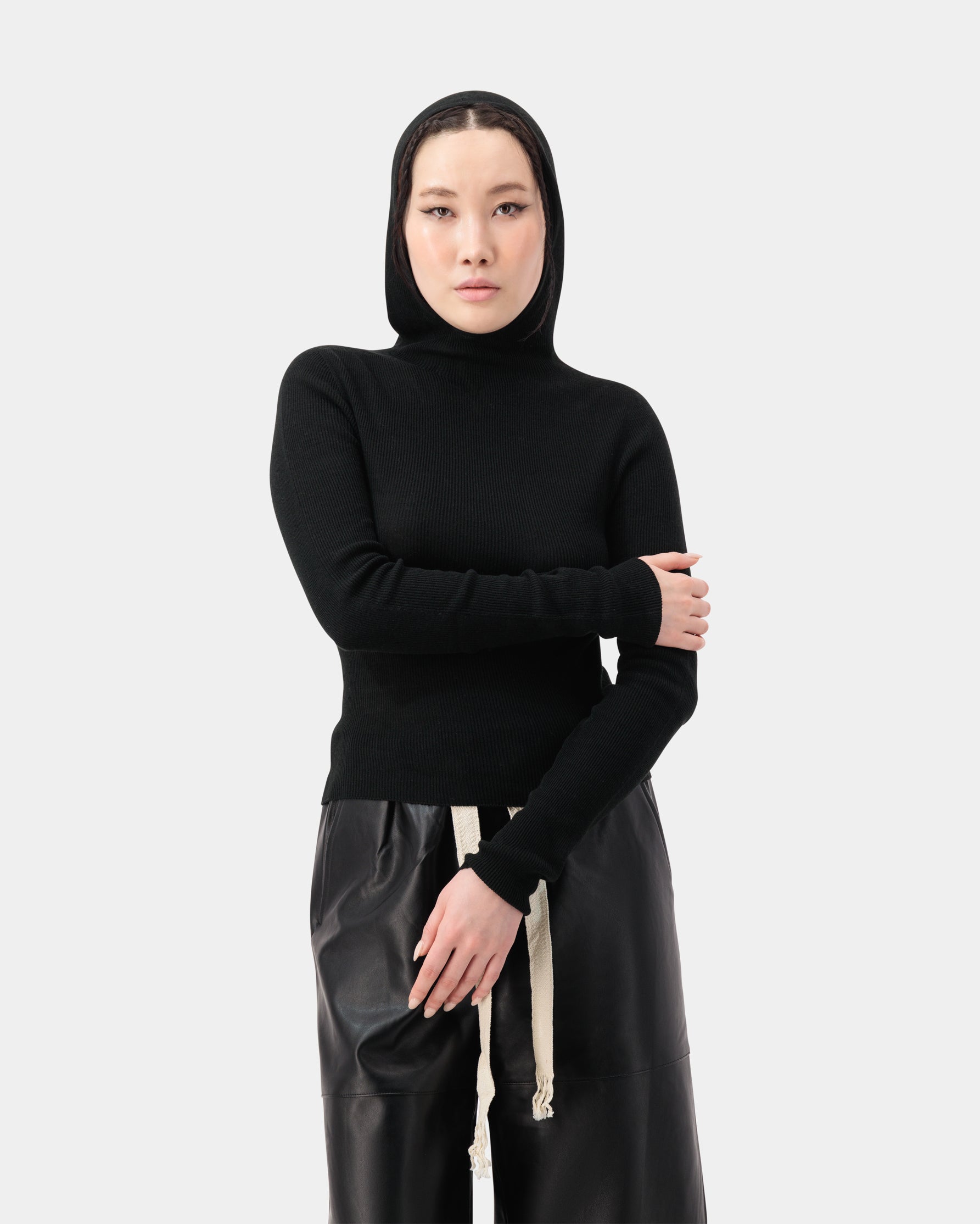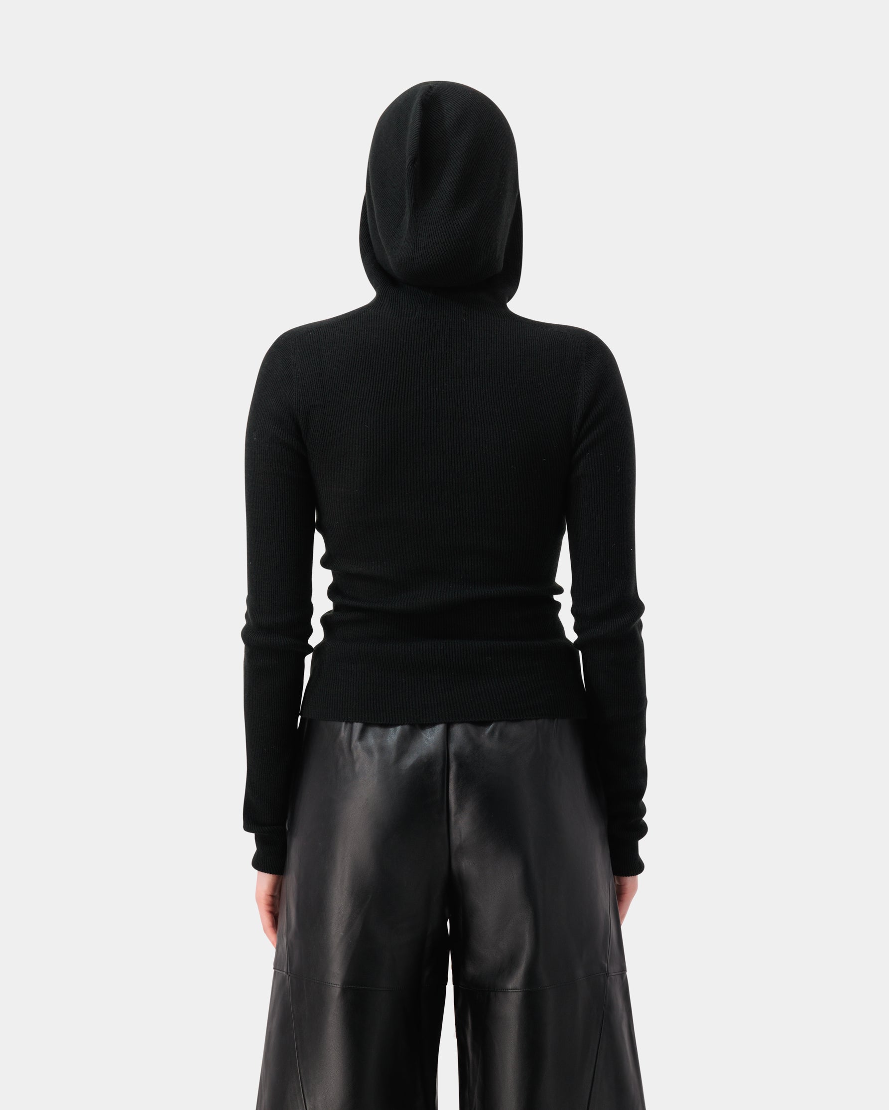 Whole garment hooded knit top crafted from a blend of cotton, poly, and acrylic, offering a relaxed yet structured fit for versatile styling.