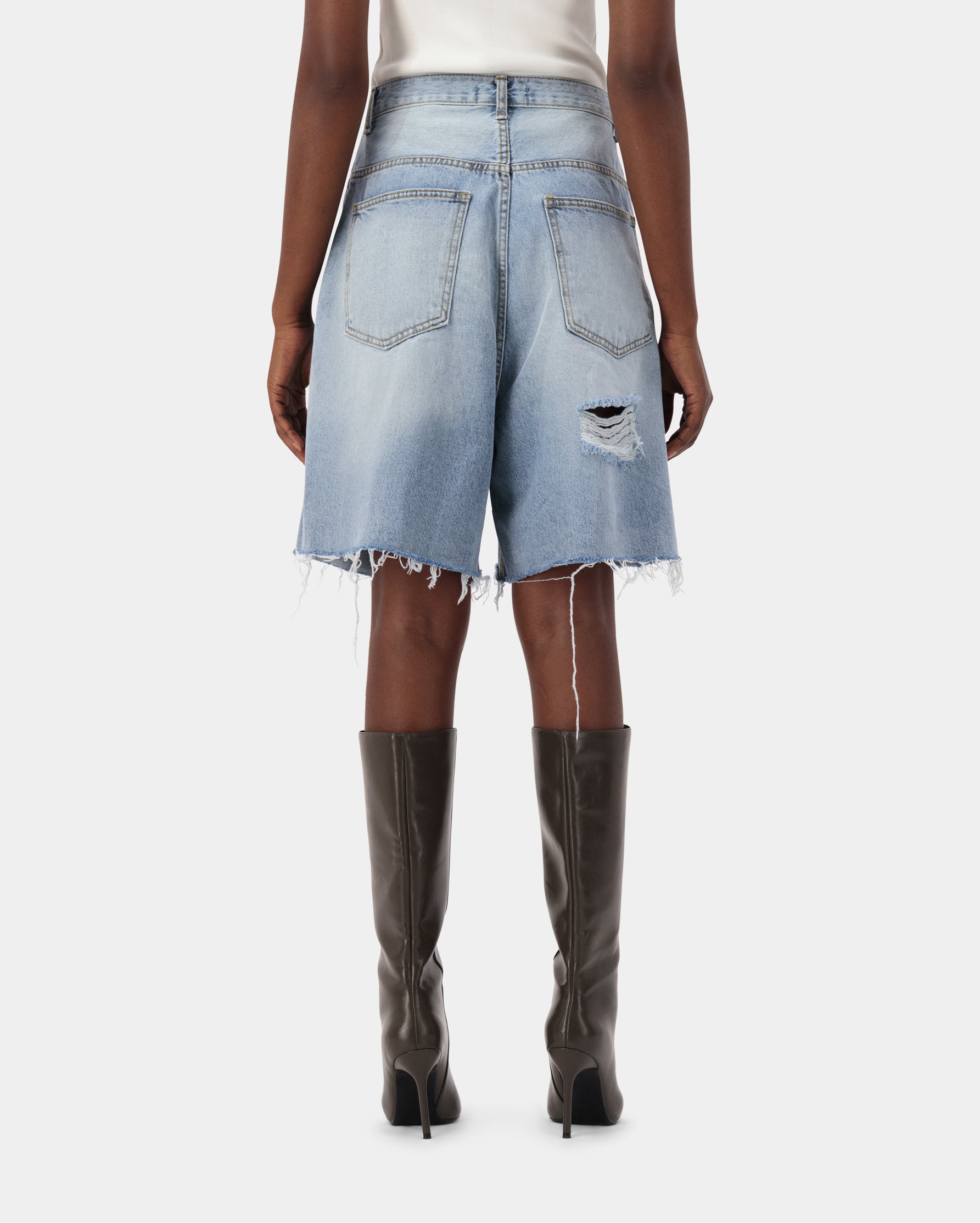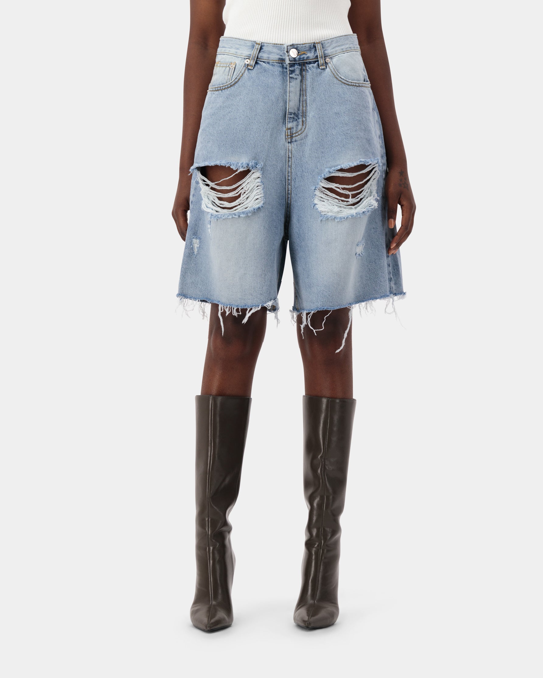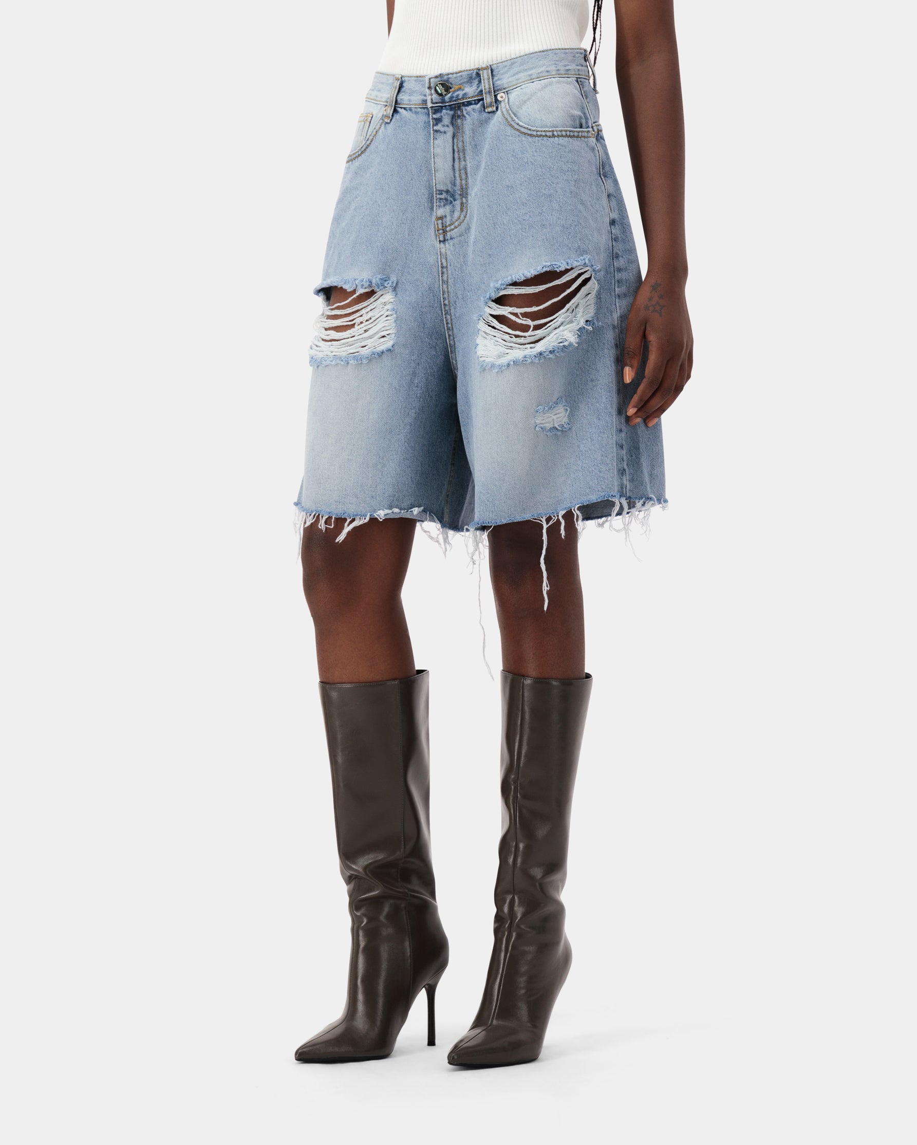 Destroyed Bermuda denim jeans made from 100% cotton denim, featuring a relaxed fit and edgy distressed details.