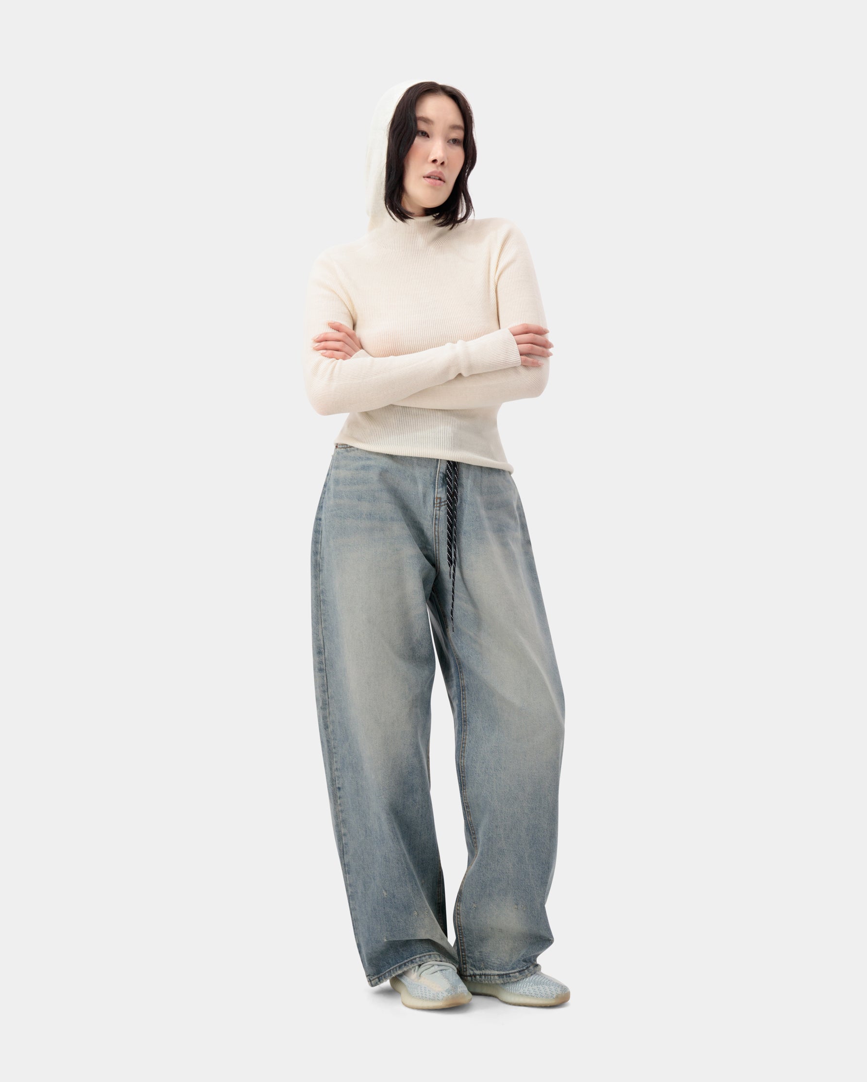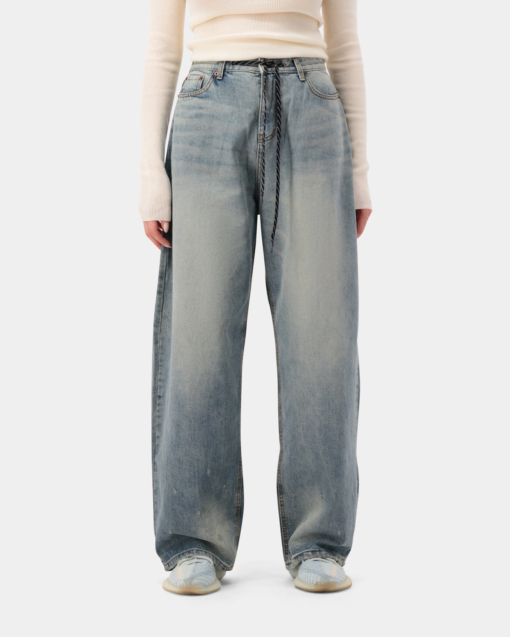 Drawstring detail wide blue denim jeans, made from 100% cotton for a relaxed yet refined finish.