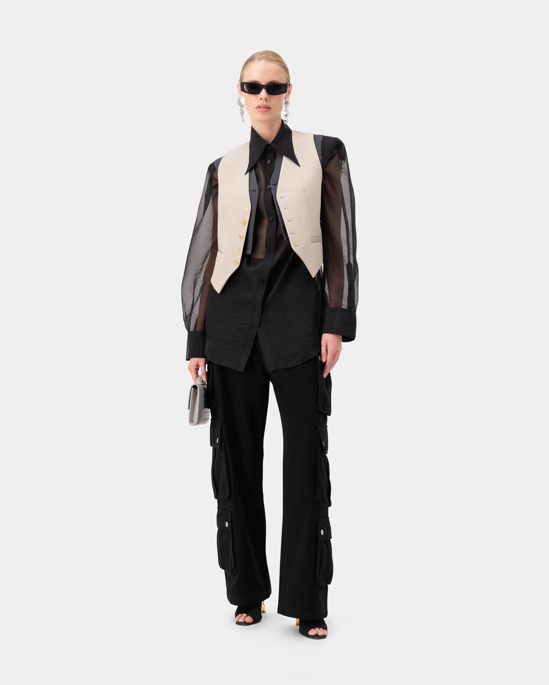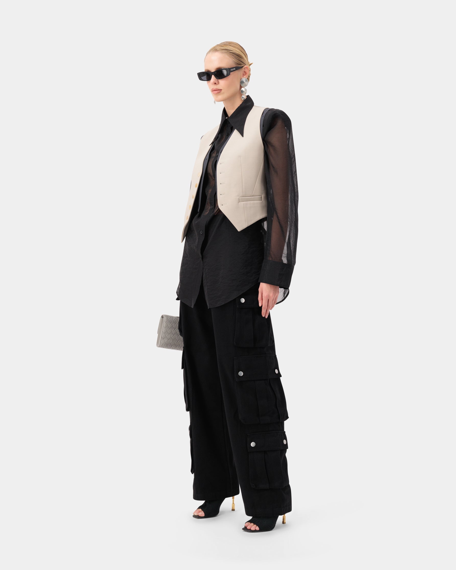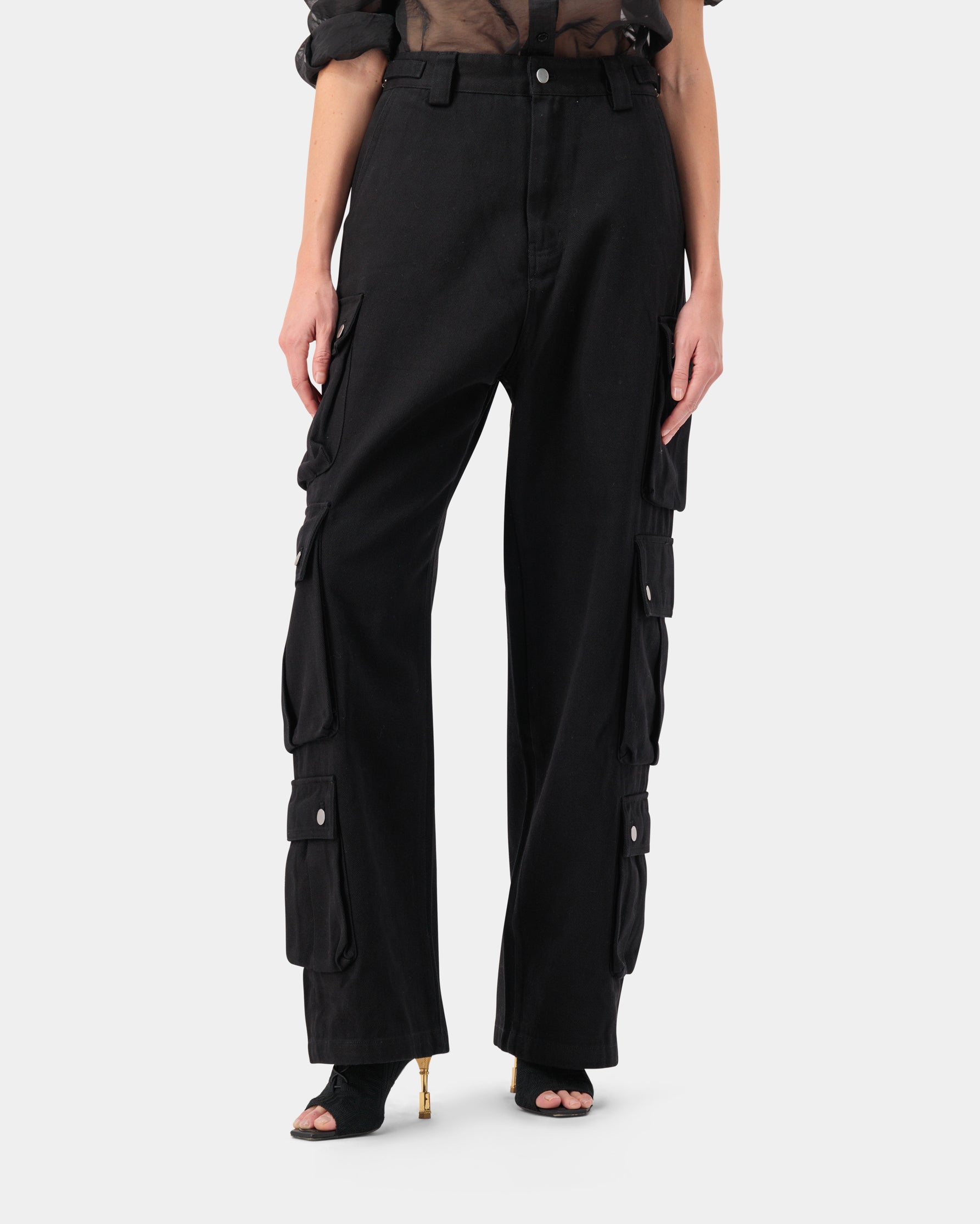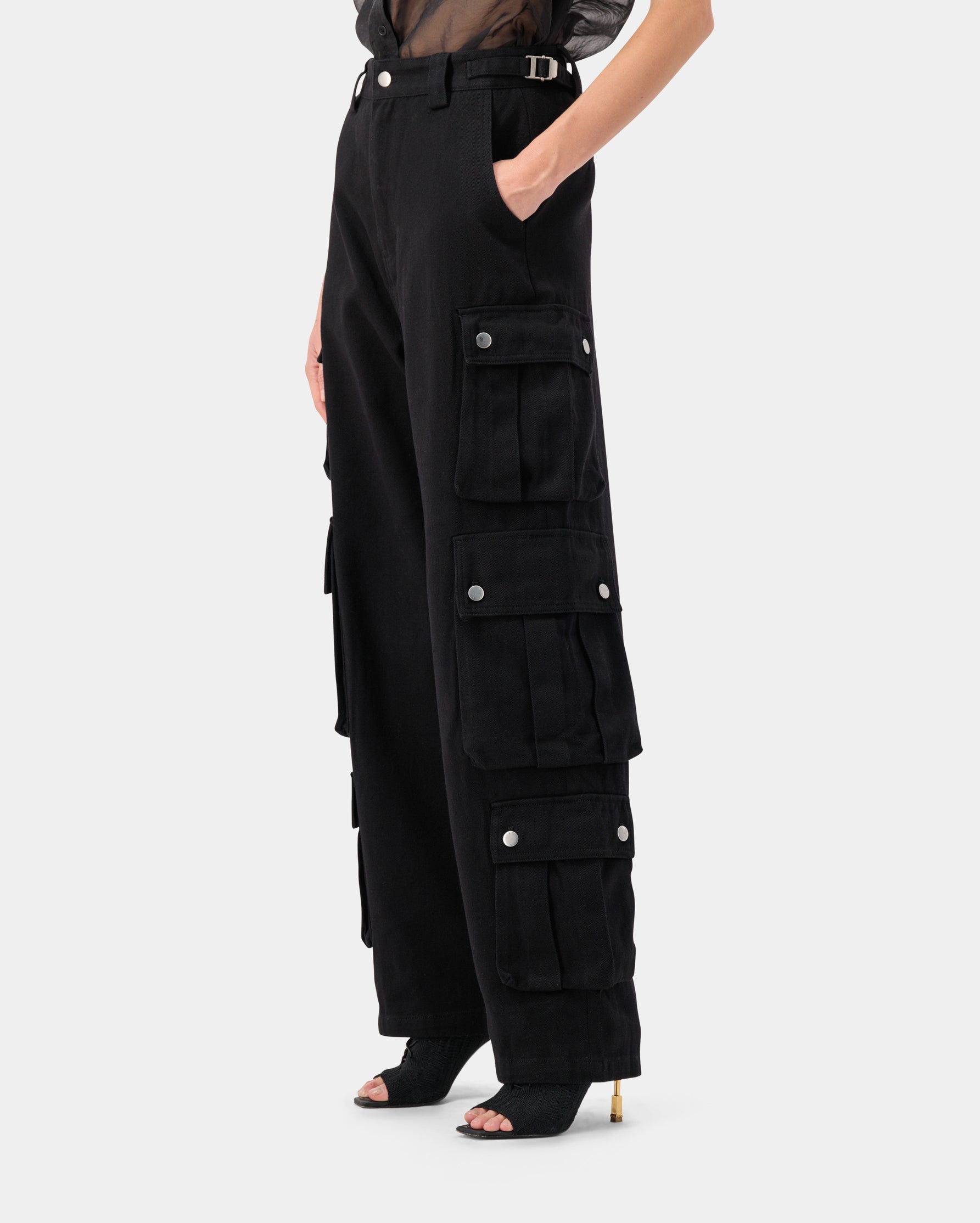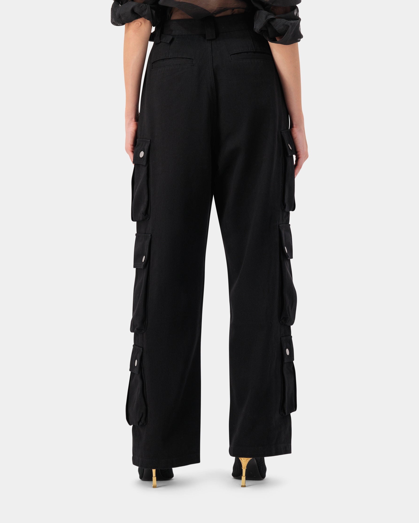 Three-pocket snap button detail cargo wide trousers, made from 100% cotton for a functional yet sleek look.