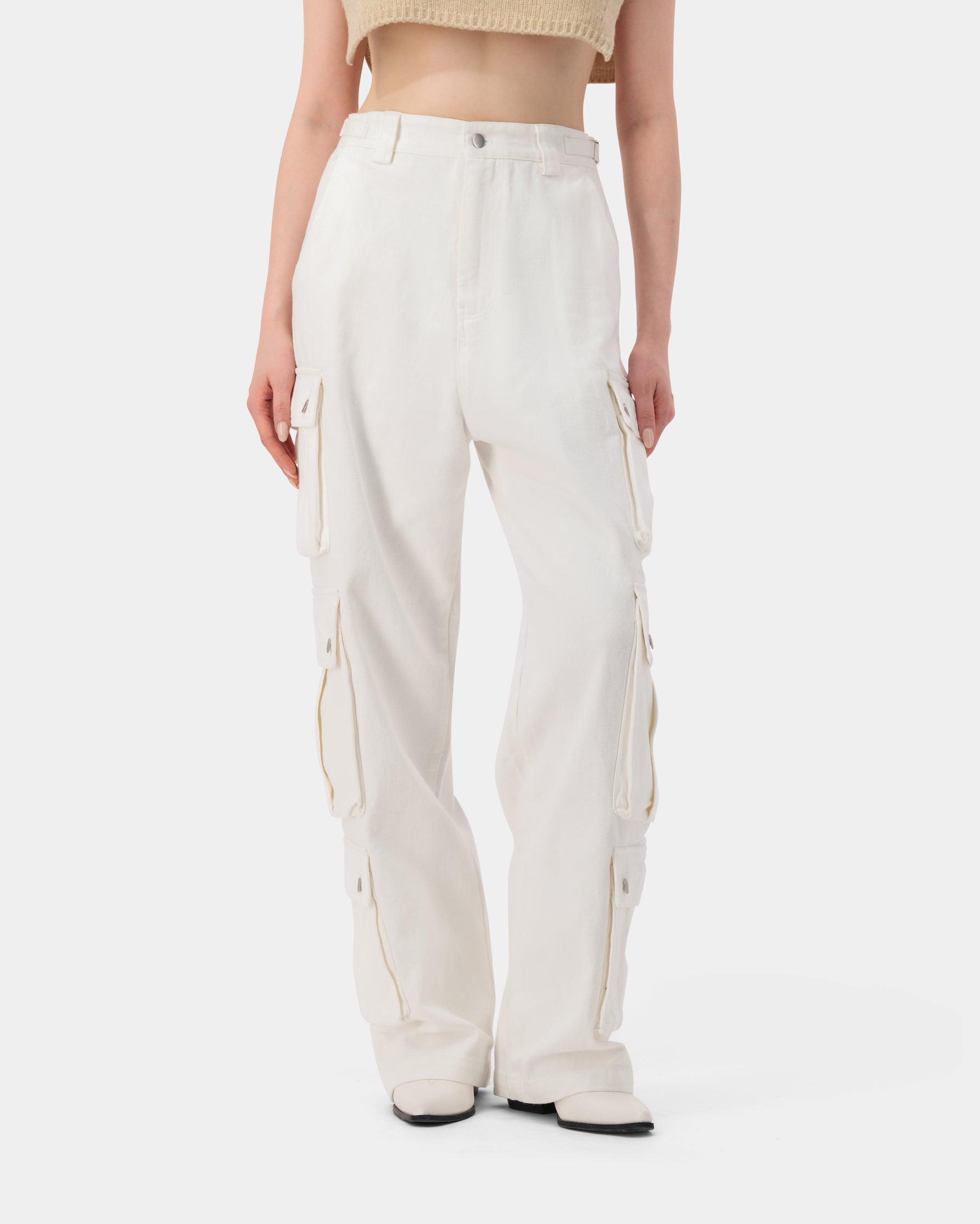 Three-pocket snap button detail cargo wide trousers, made from 100% cotton for a functional yet sleek look.