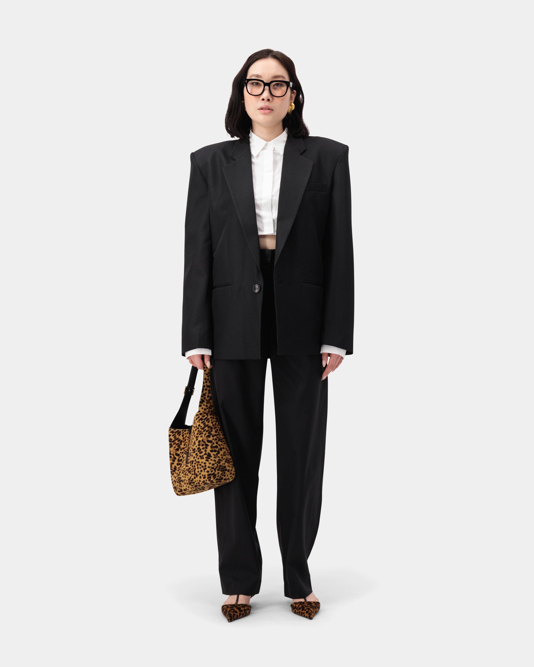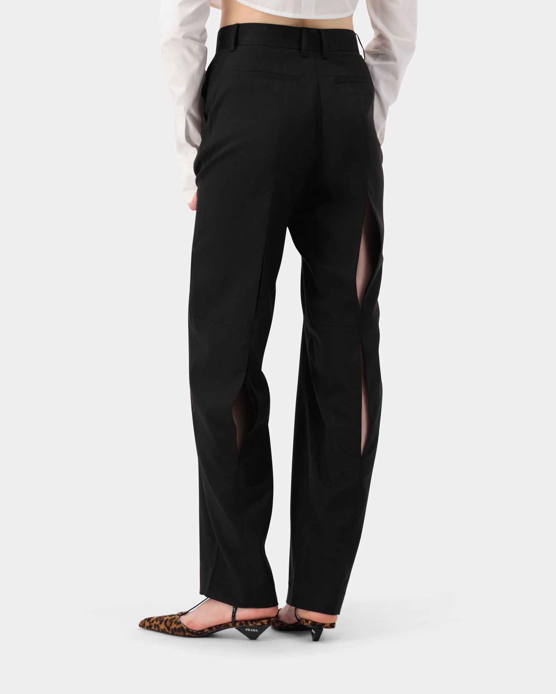 Semi-wide fit trousers featuring a distinctive back double slit detail. Crafted from a blend of wool, tencel, and spandex for structure and comfort.