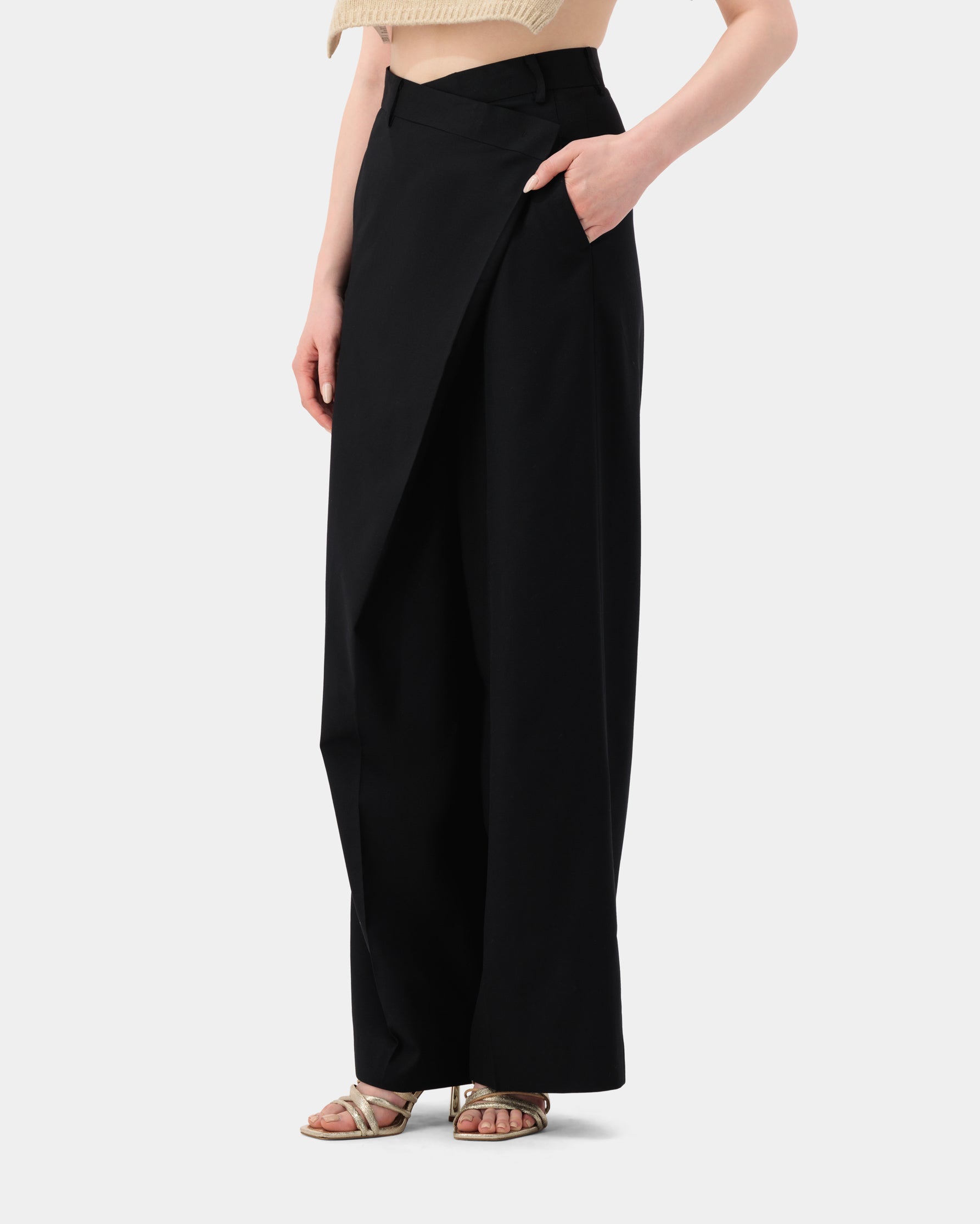 Asymmetry pin-tuck wide maxi trousers, crafted from wool, poly, and rayon for a flowing yet structured silhouette.