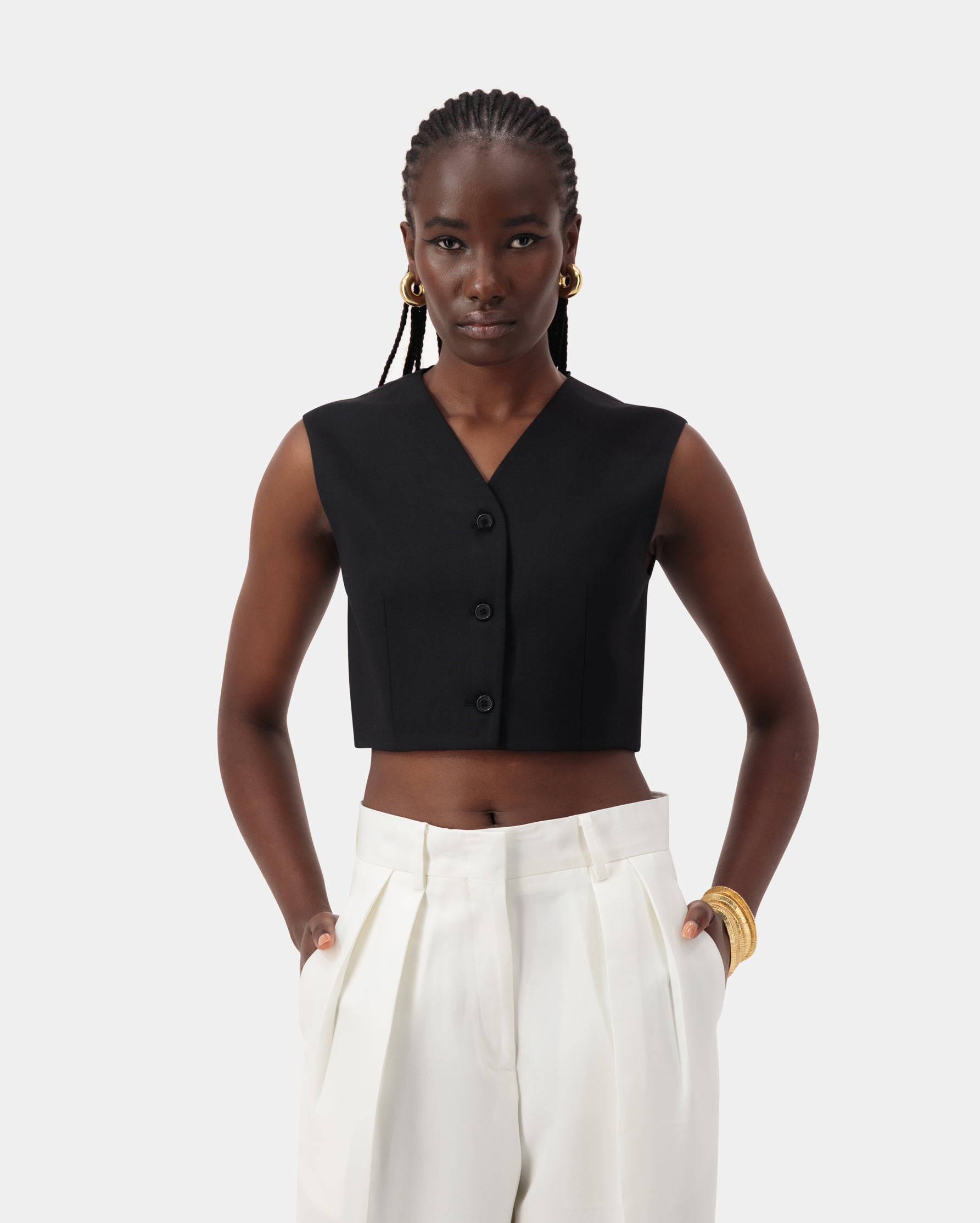 Tailored cropped vest with three-button detail, made from a soft mix of wool, tencel, and spandex for a sleek, layered look.