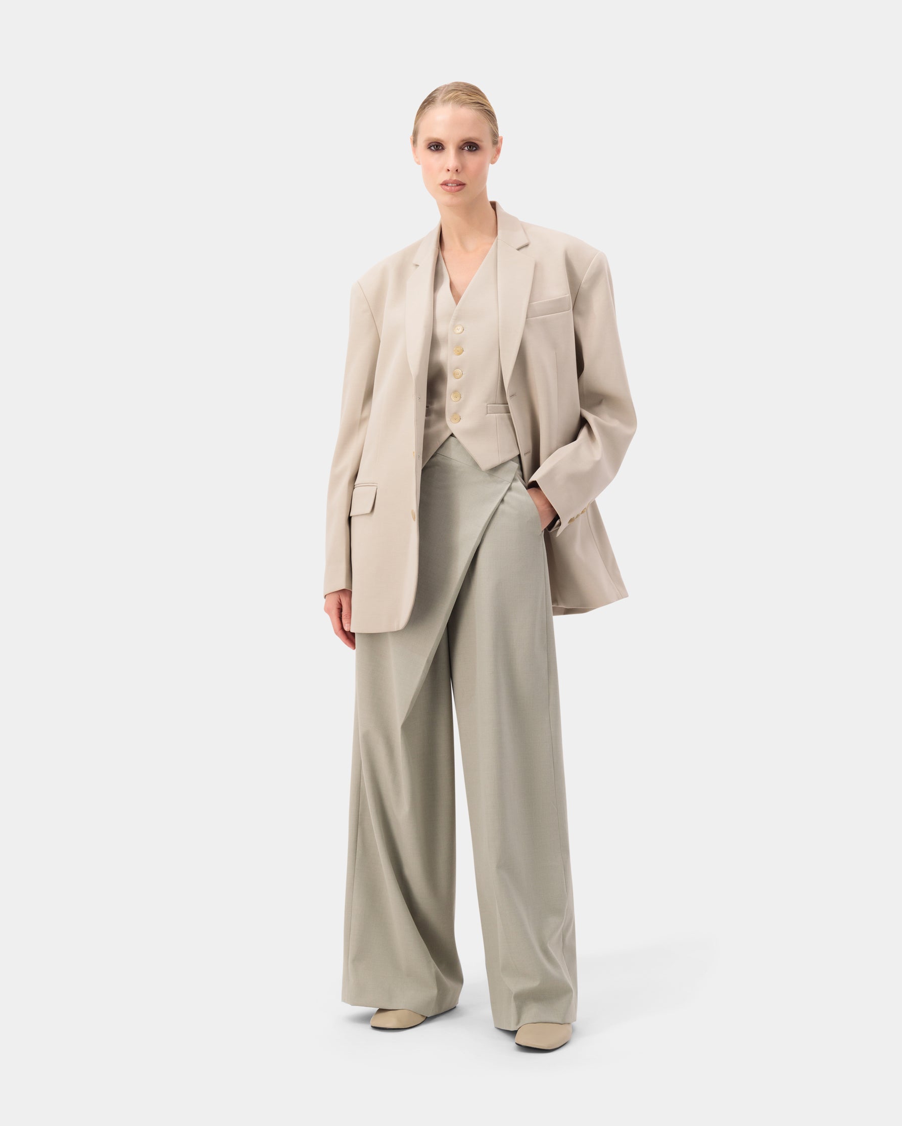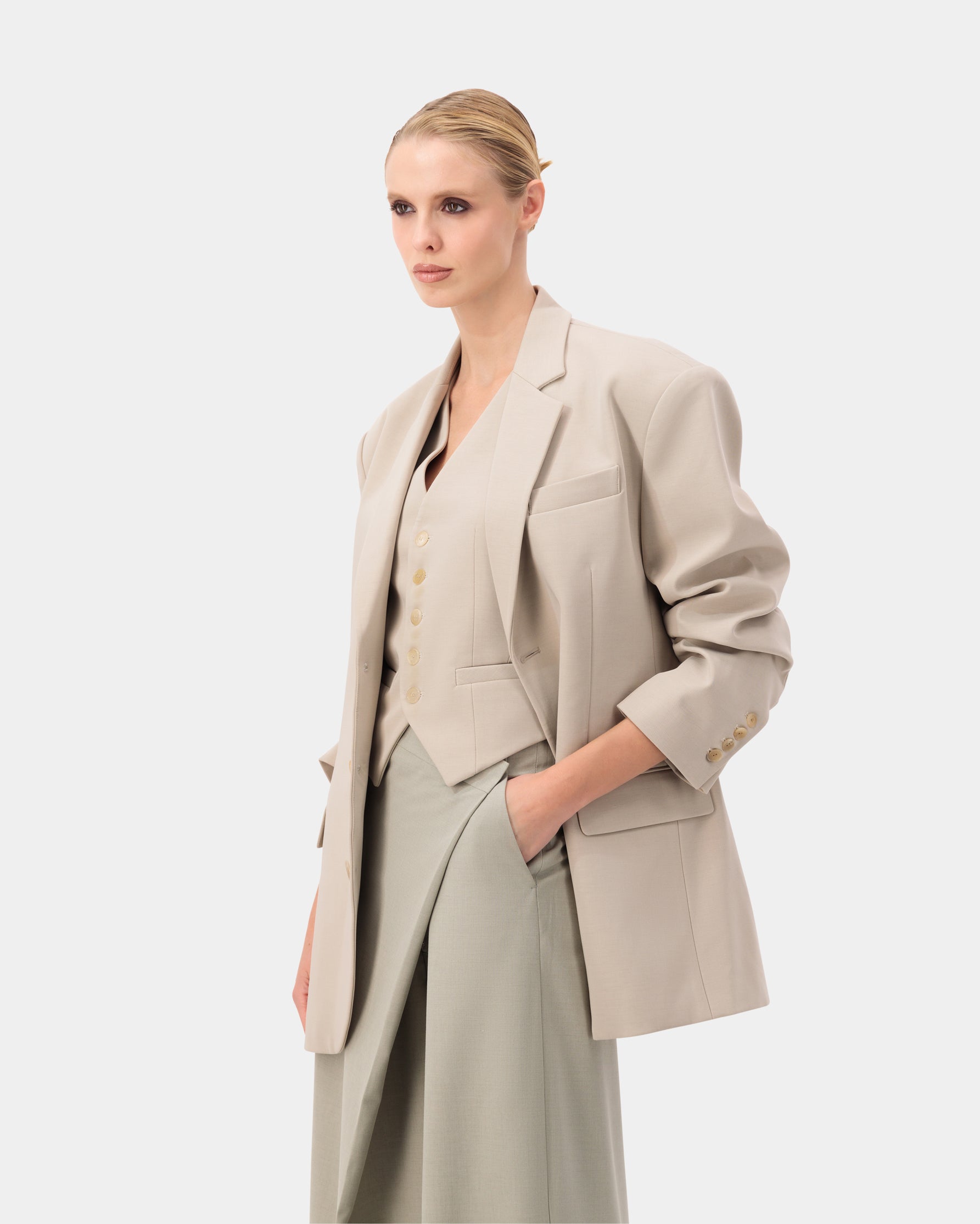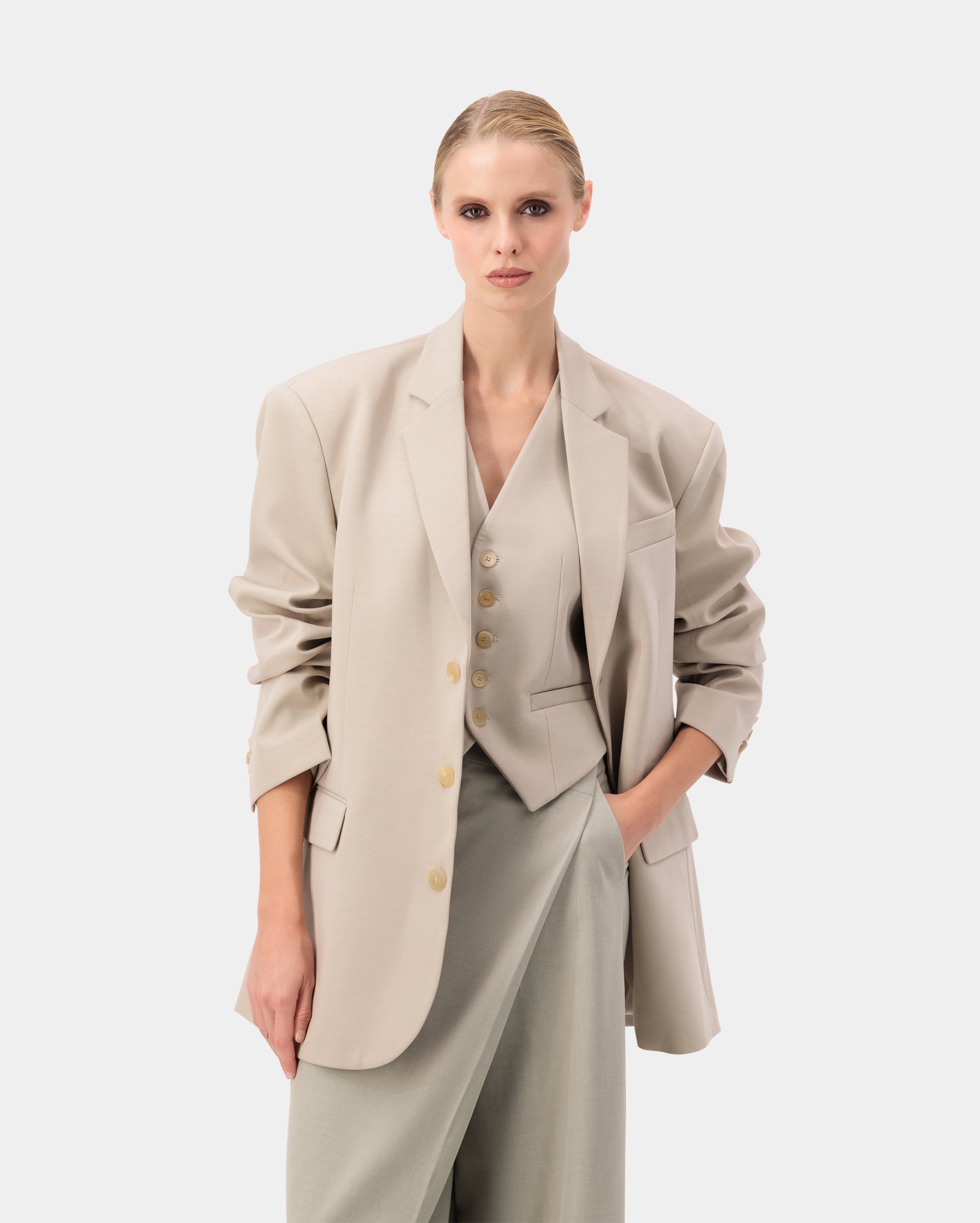 Oversized three-button single blazer, crafted from a mix of polyester, rayon, wool, and spandex for a bold yet refined look.