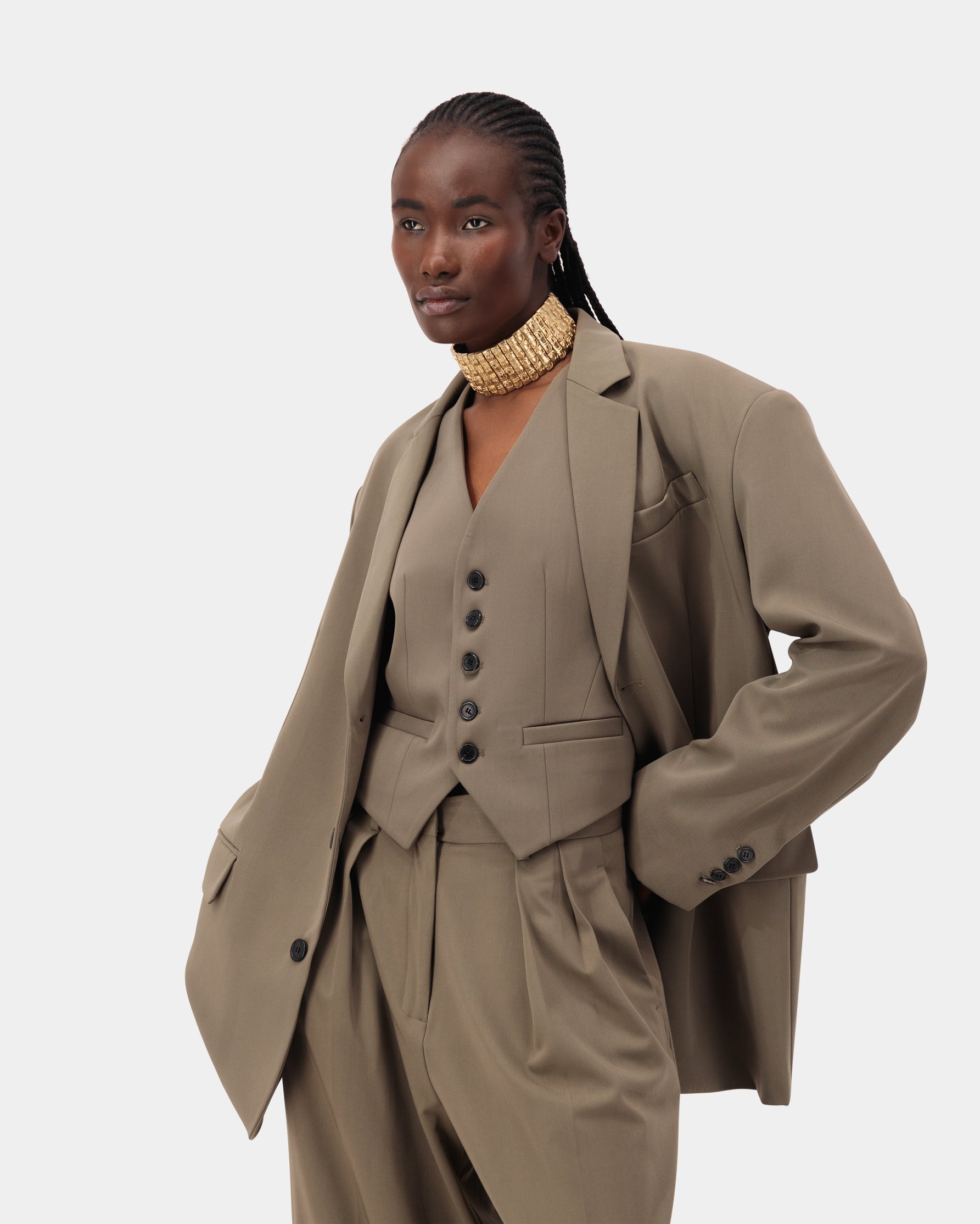 Oversized three-button single blazer, crafted from a mix of polyester, rayon, wool, and spandex for a bold yet refined look.