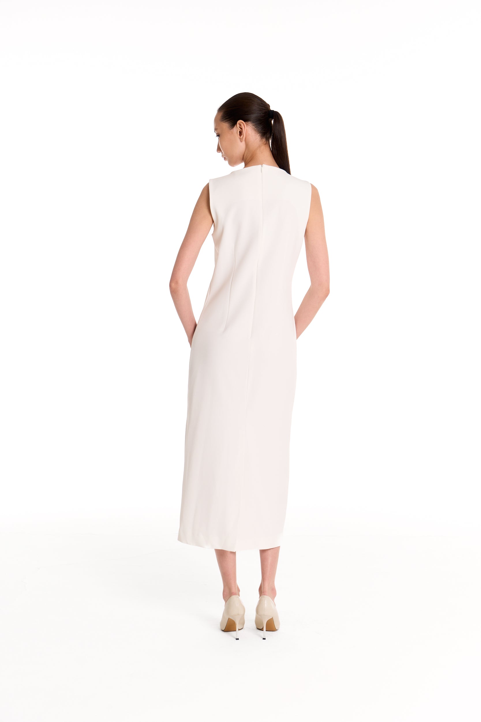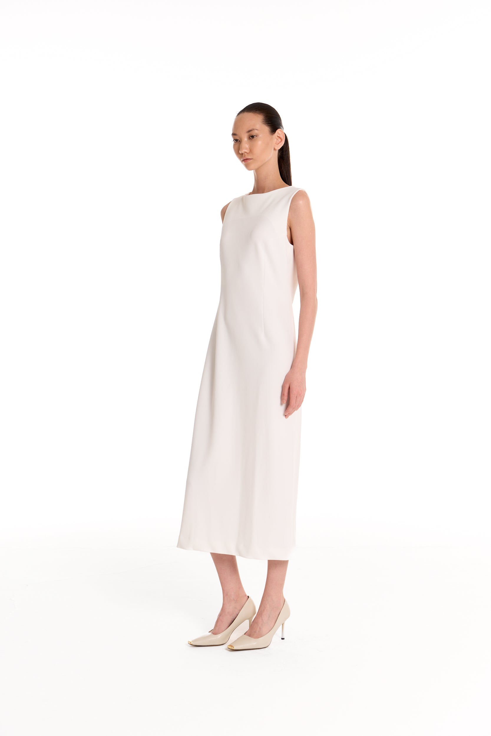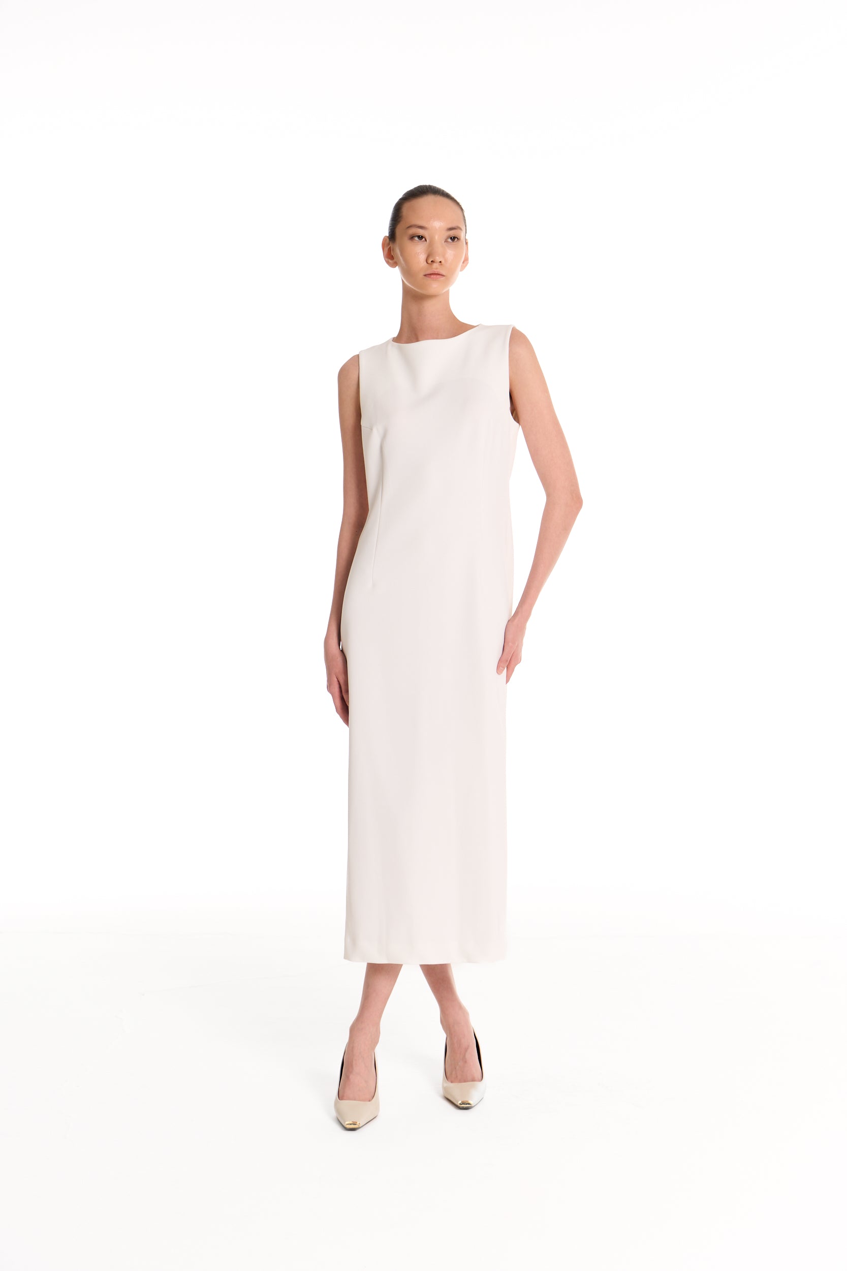 A sleeveless midi dress designed with a clean, elongated silhouette. The Pure Line Dress skims the body with subtle structure, creating a modern, effortless look that moves seamlessly from day to evening.