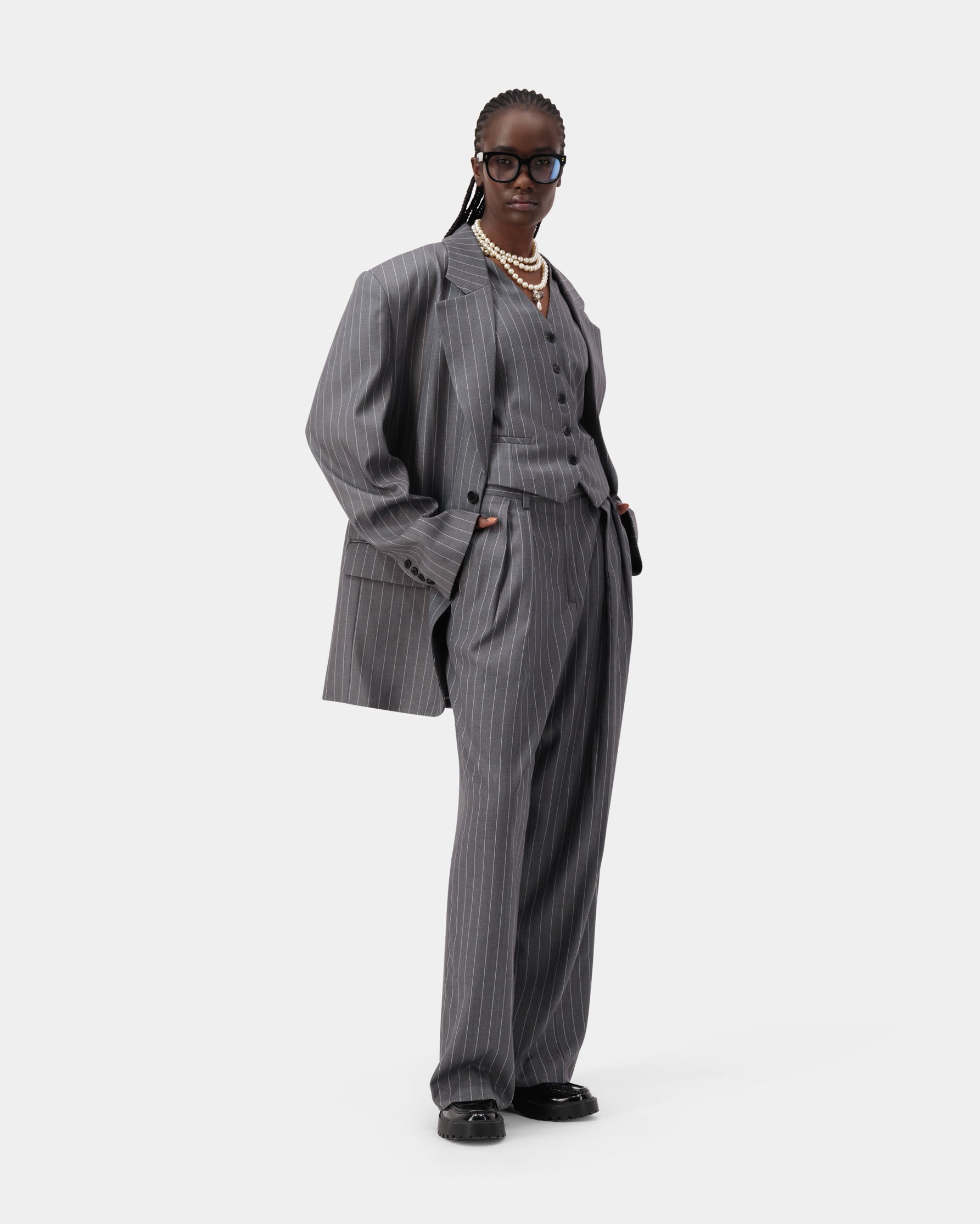 Wide pin-stripe pleated trousers, made from a poly-rayon blend for a classic and versatile fit.