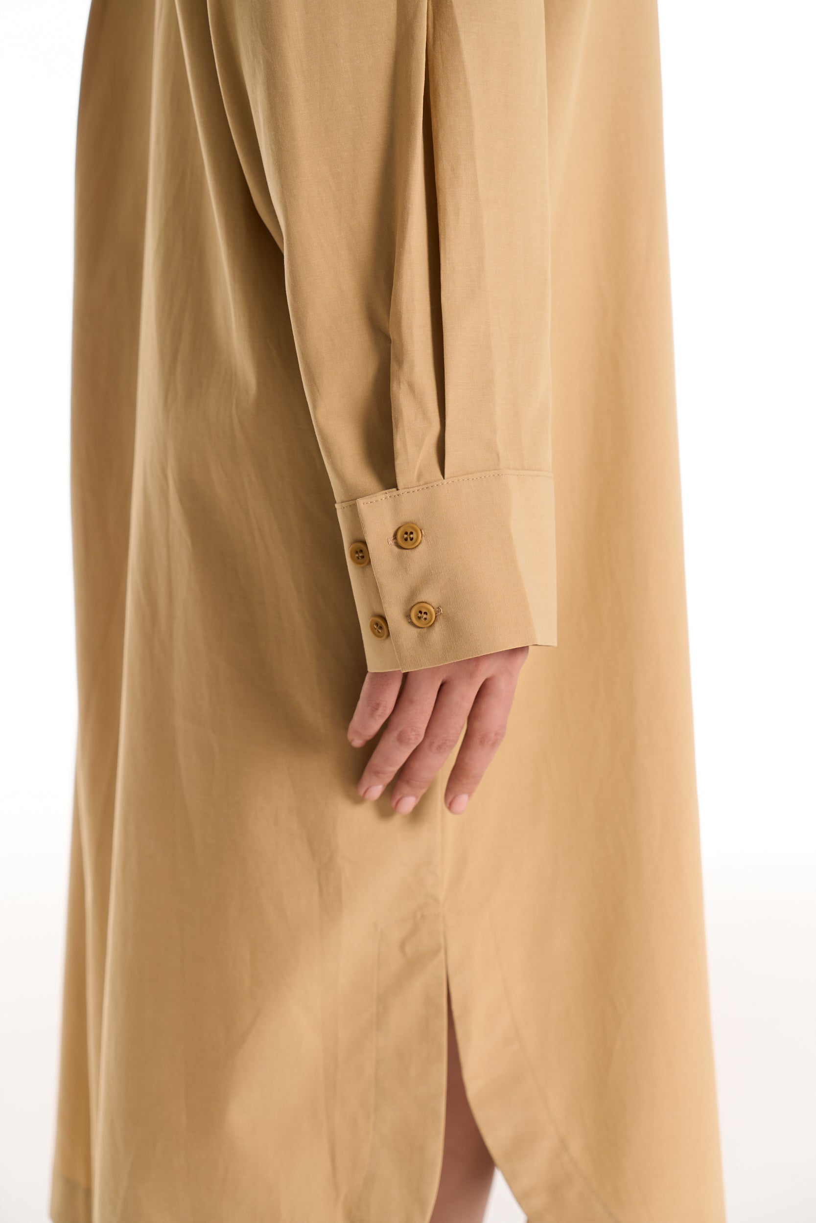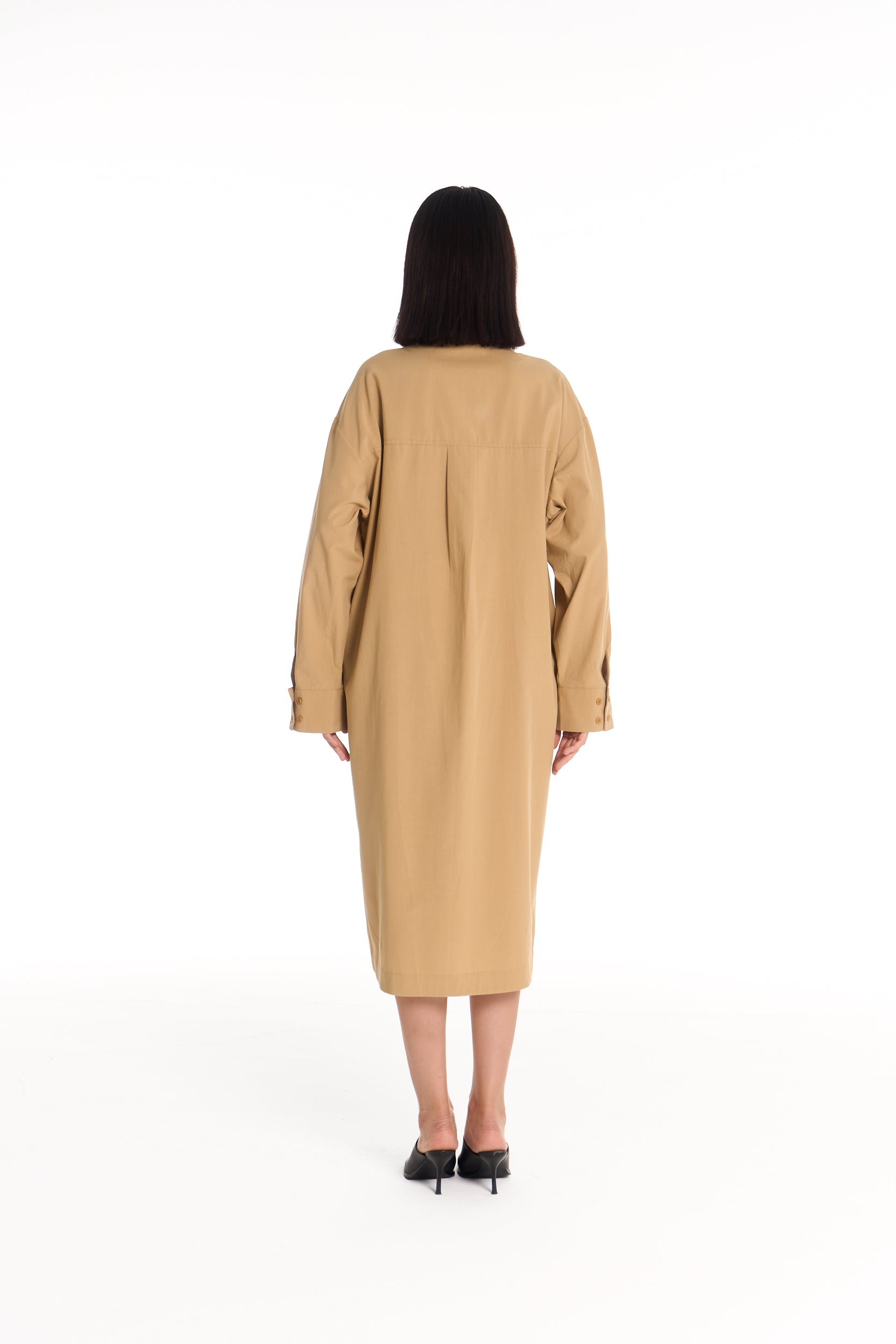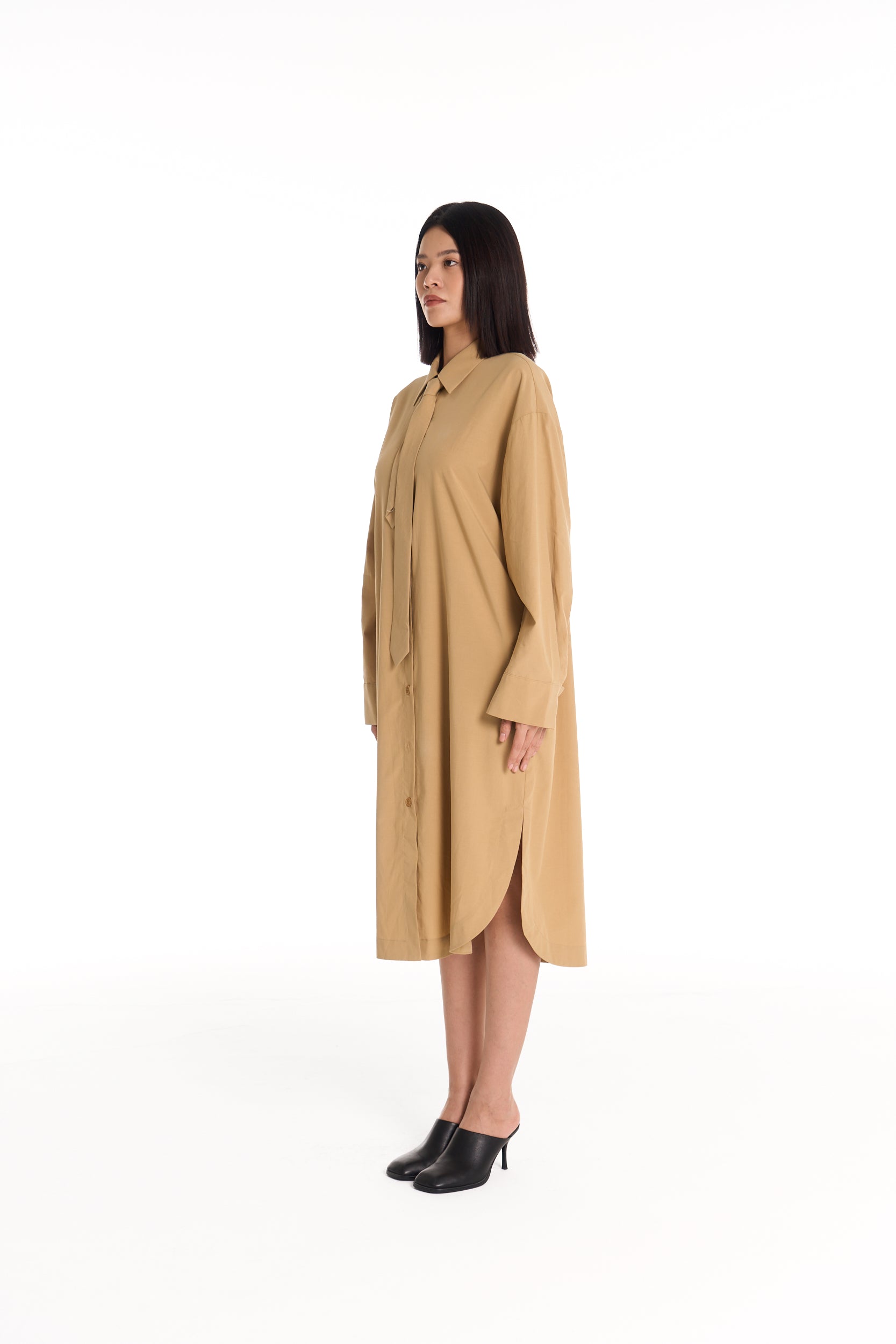 A relaxed shirt dress designed with an elongated, modern silhouette. The Tailor Shirt Dress blends clean tailoring with ease, offering versatile styling as a layer or standalone piece.