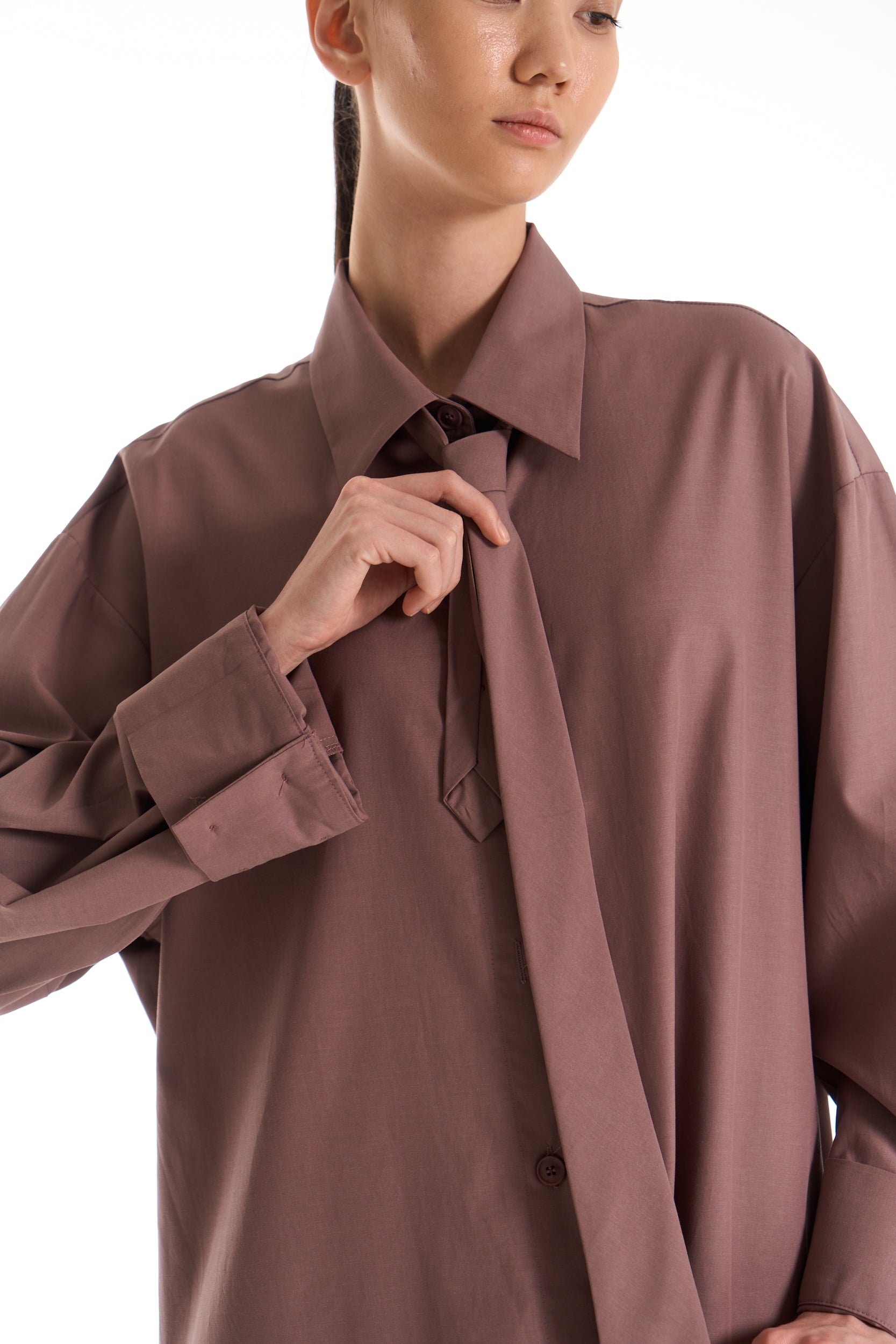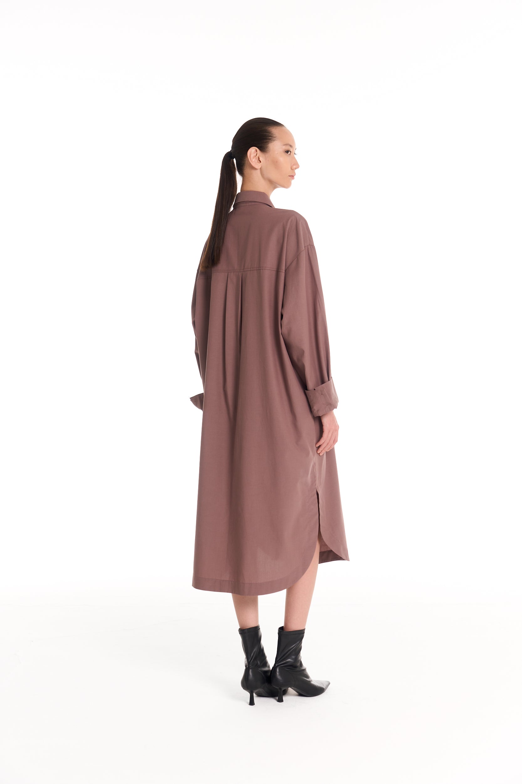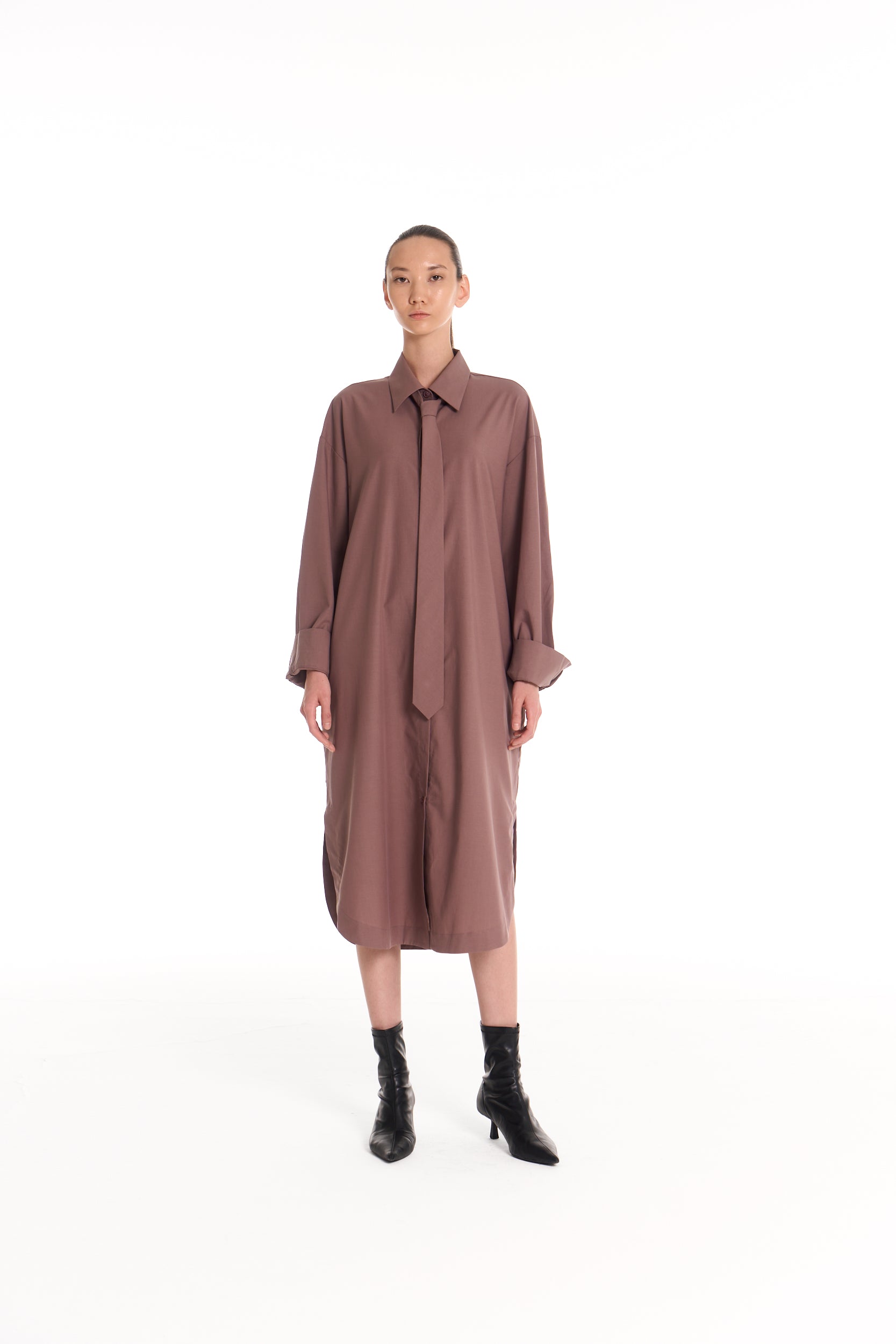 A relaxed shirt dress designed with an elongated, modern silhouette. The Tailor Shirt Dress blends clean tailoring with ease, offering versatile styling as a layer or standalone piece.
